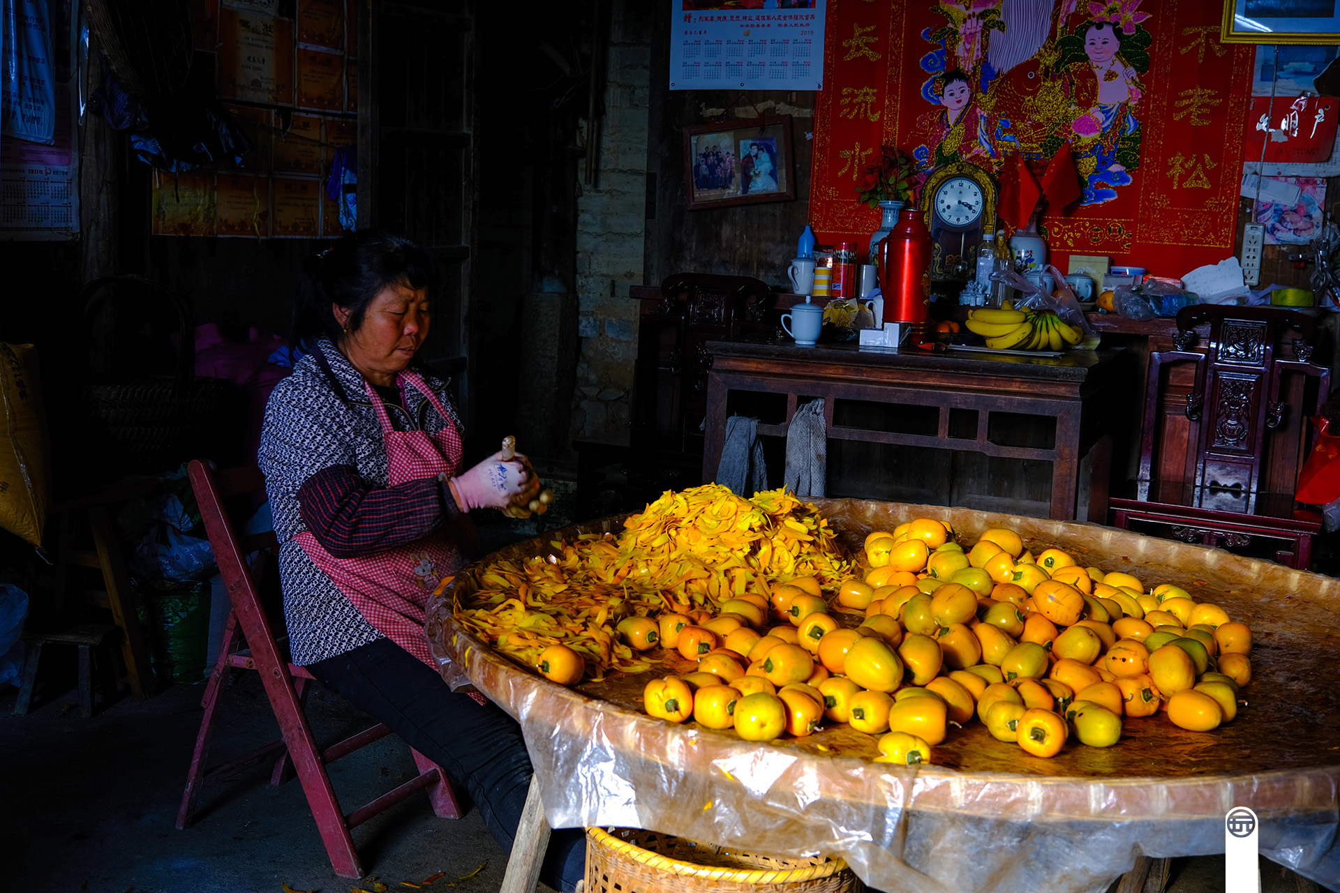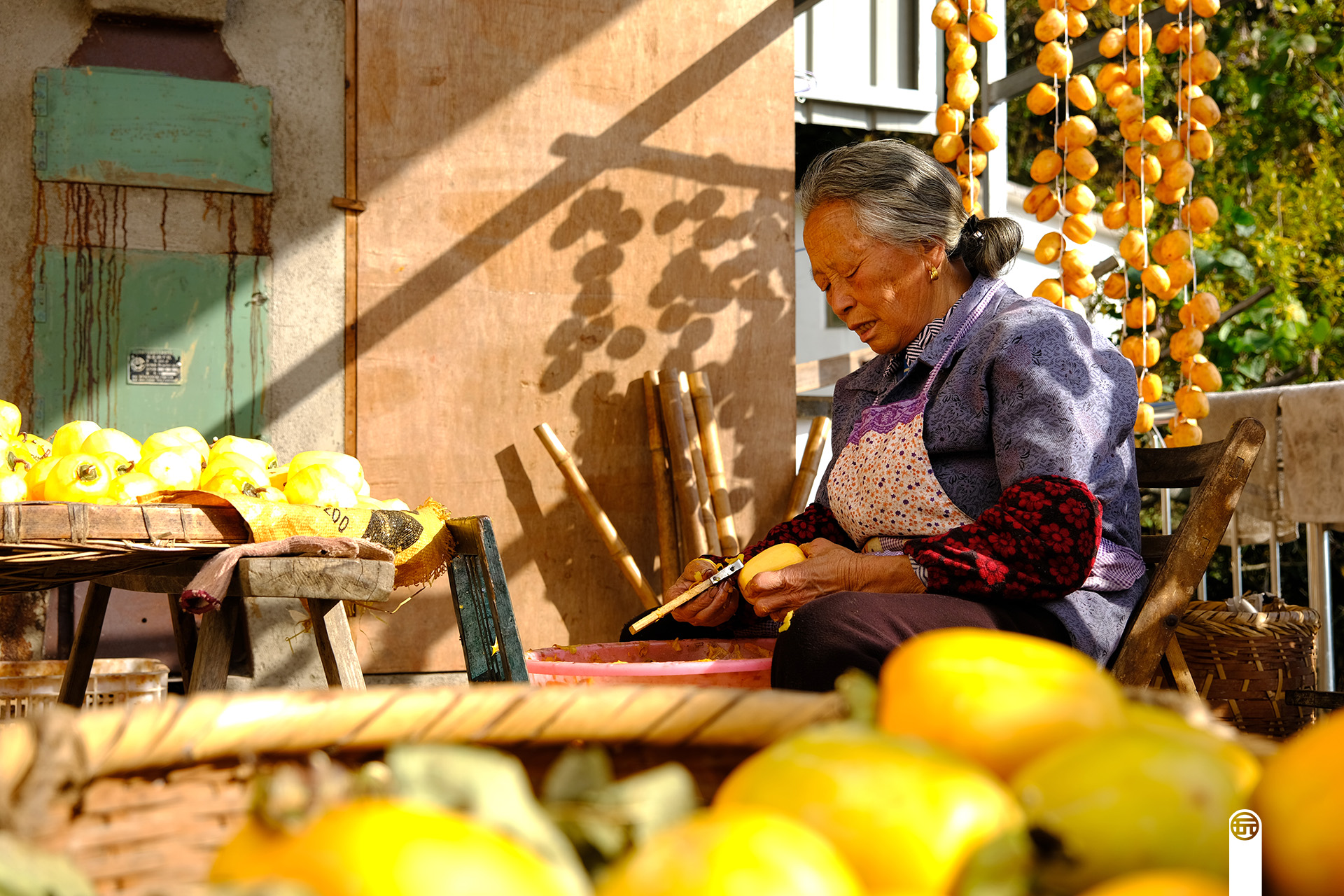 这位大妈就是自己在家加工柿子饼,一只硕大的竹匾上,铺满了新鲜的柿子。