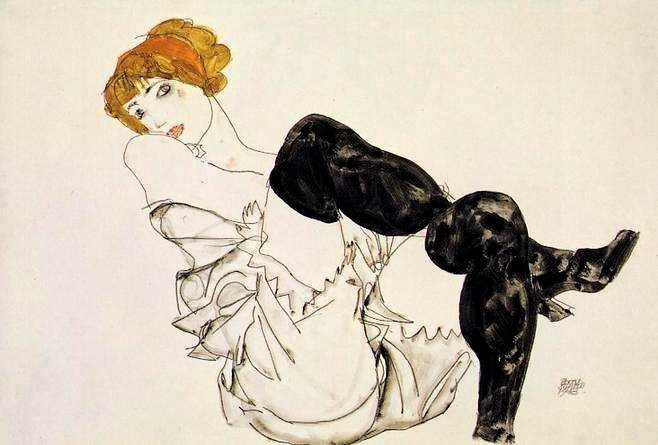 右:埃贡·席勒,《穿黑袜的女人(瓦莉·纽泽尔)》,1913年。