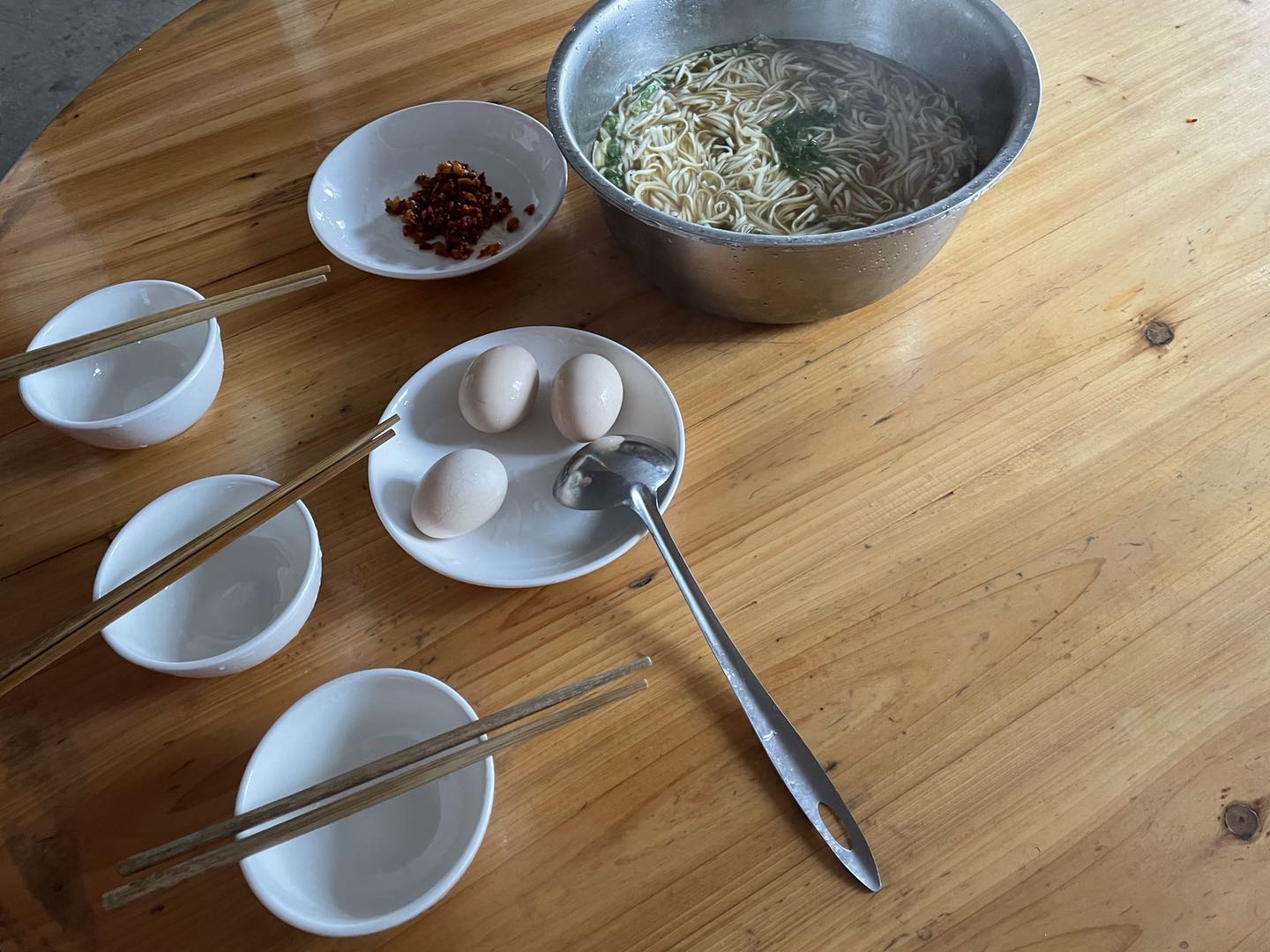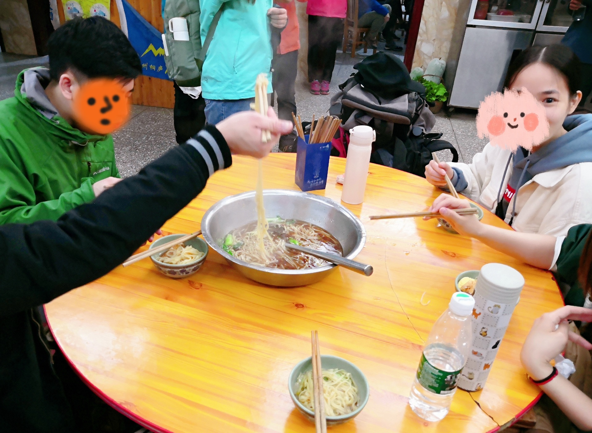 山脚下仅有一家的早餐店,我们三个跟两位兄弟吃了50元的一大盆煎蛋青菜家常面,人均10元。还有2元一根的登山竹棍。价格有点惊讶到,一点都不像景区该有的价格,而且还是唯一一家。
