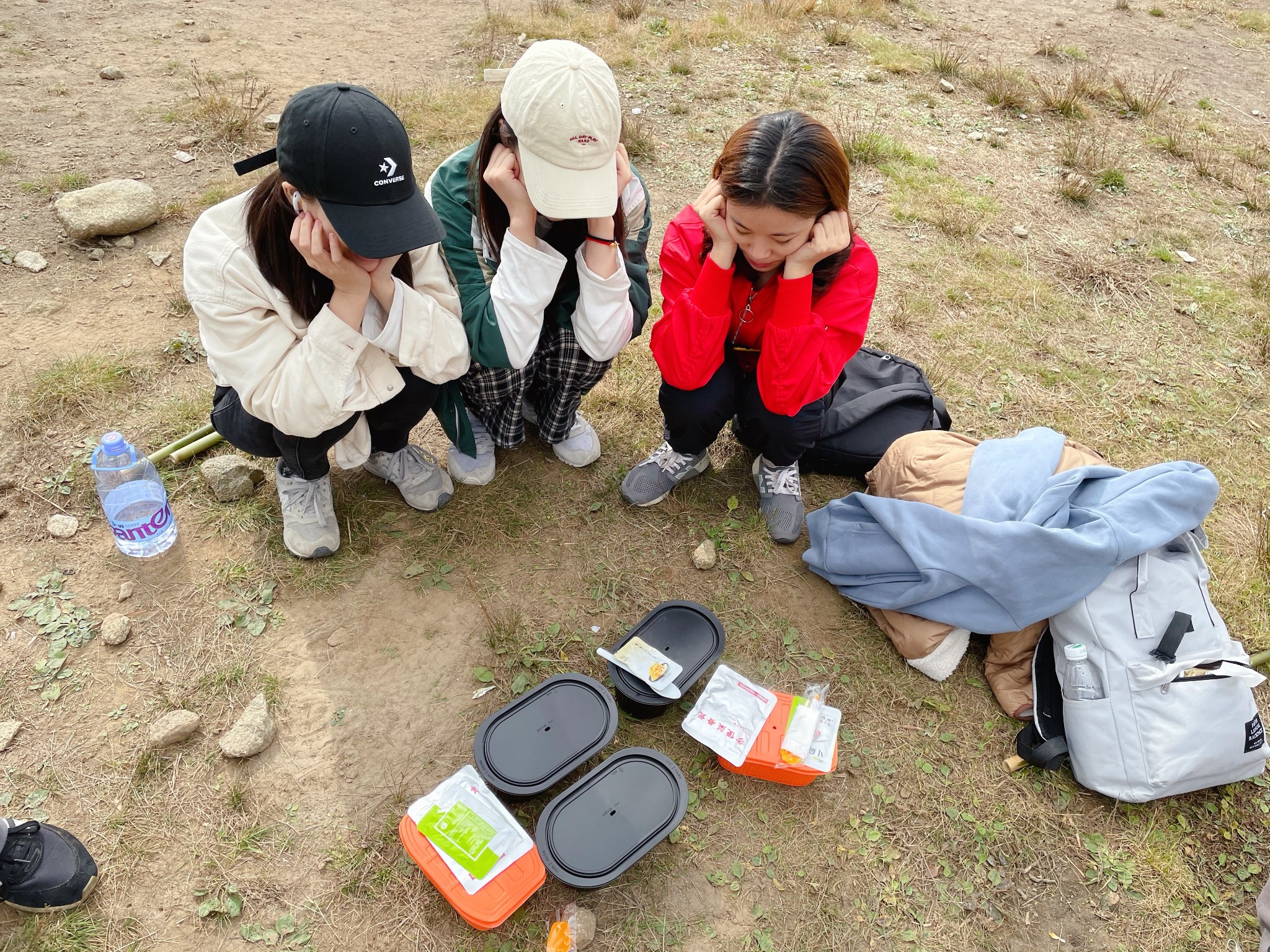 中午到达发云界,到达的第一个石碑,拍完照后终于想到要释放包里的两盒自嗨锅了。实在不想背着,我们三都各自给了一盒那两位兄弟,然后坐在风中一起自嗨午餐。