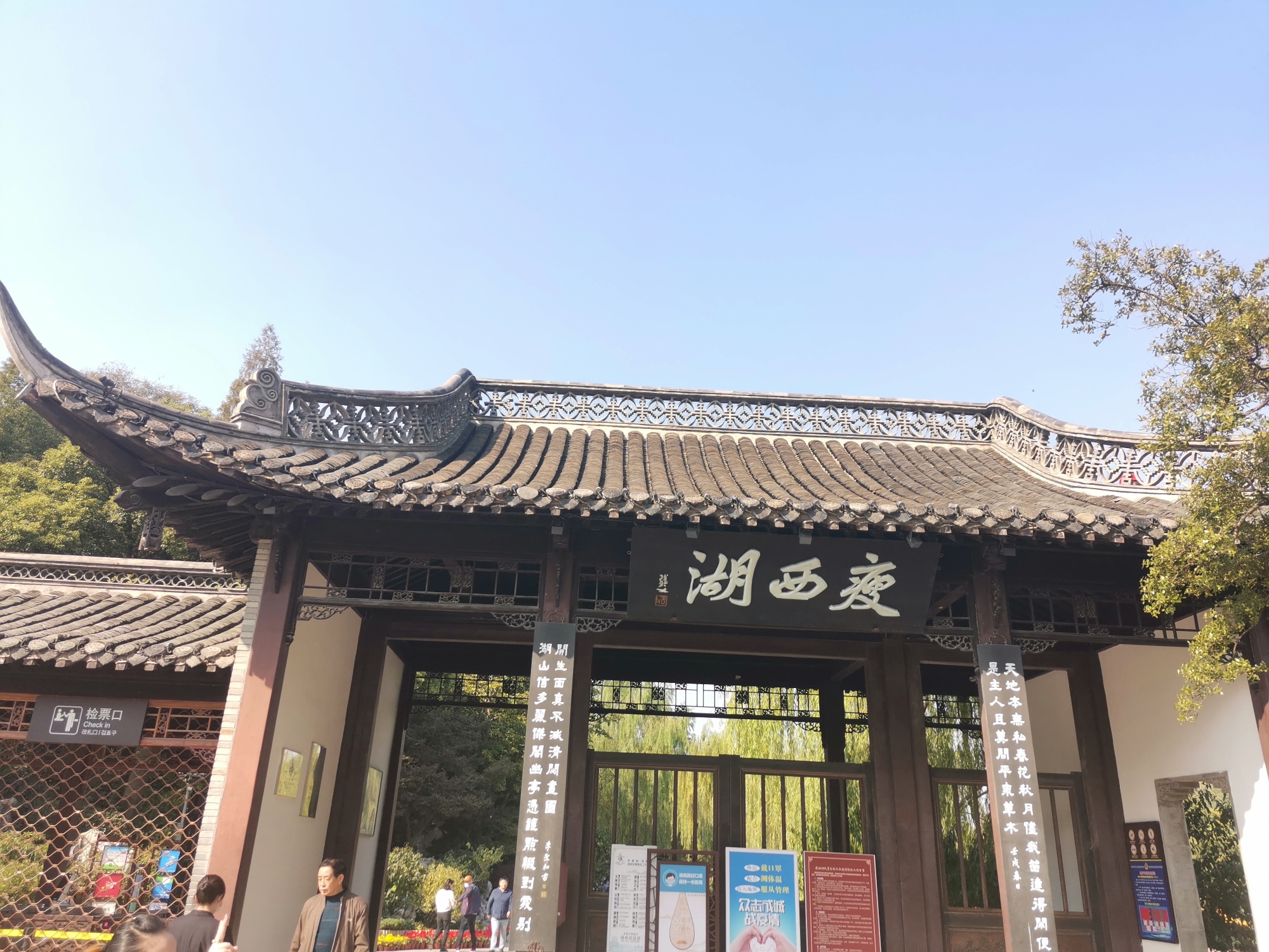 吃完了午餐散步就到了瘦西湖景区。瘦西湖在疫情期间分时进场,提前在飞猪上买好了2点进场的门票。我们十二点到达扬州站,吃完饭散步到瘦西湖南门处是一点四十五分左右,刷身份证可以直接进场,现场门票是100元。