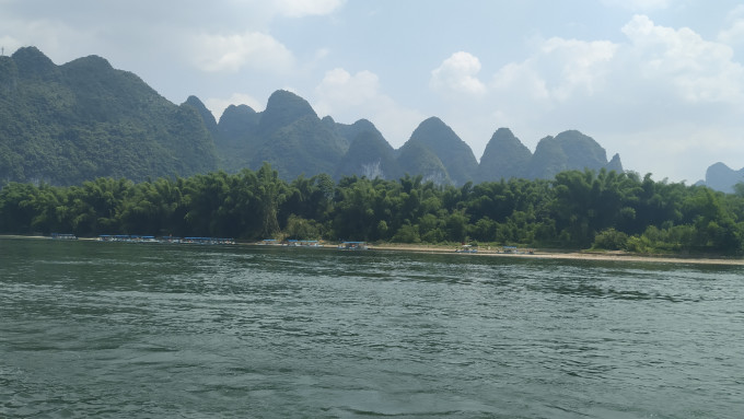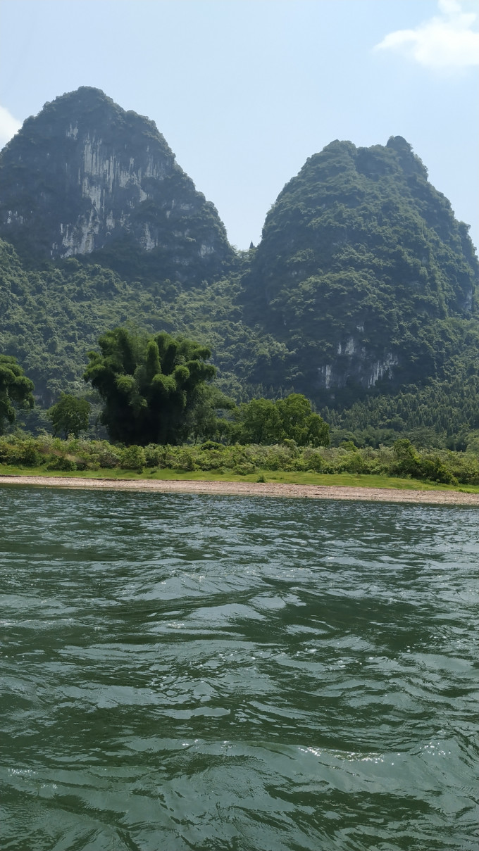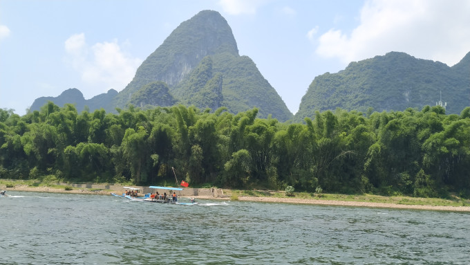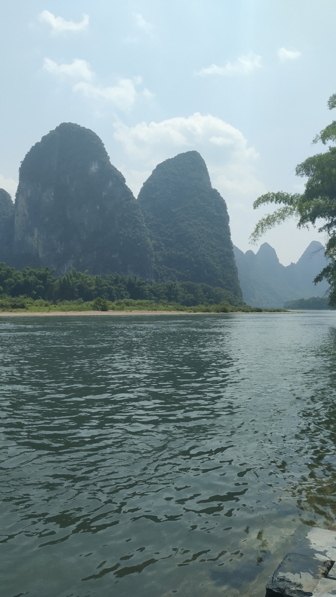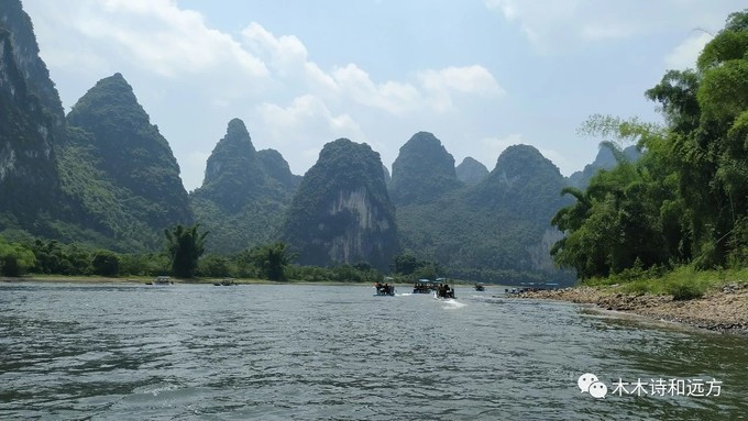夏季是丰水期,所以漓江的水也是非常绿的,在阳光的照耀下闪闪发光。来往的竹筏络绎不绝,由于上午要给从桂林到阳朔的漓江三星游船和四星游船过漓江,所以竹筏只有12点之后才开放,所以不要太早哟,如果从桂林出发比较早的话,建议去爬爬老寨山,毕竟这也是俯瞰漓江的绝佳位置之一。