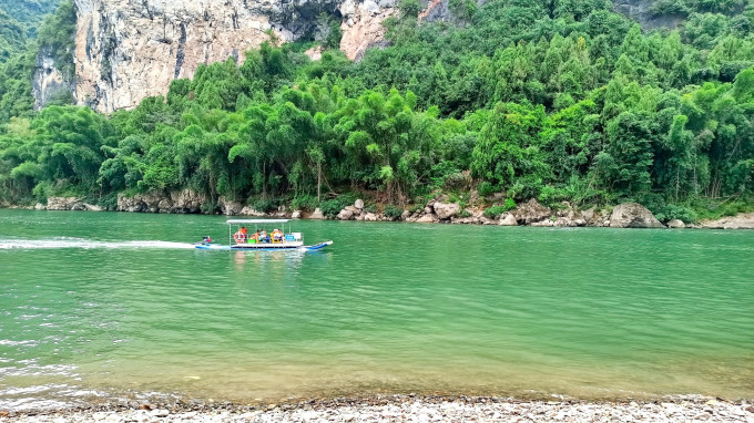 这是兴坪渔村的游船,往返约1小时,但是走的是跟竹筏相反的方向,如果带老人和孩子比较适合坐这个,竹筏对70岁以上老人和1.2米以下儿童会有限制。