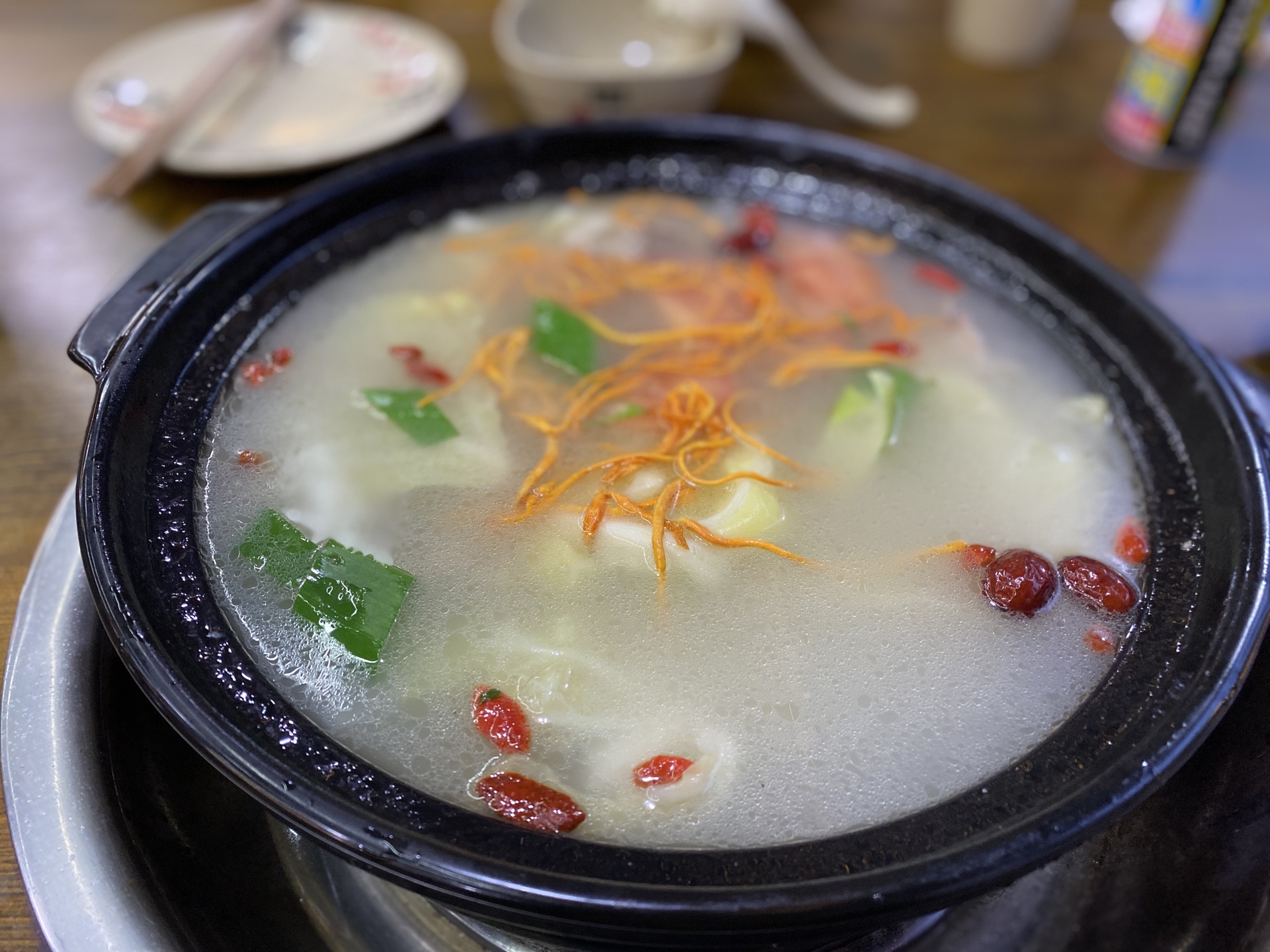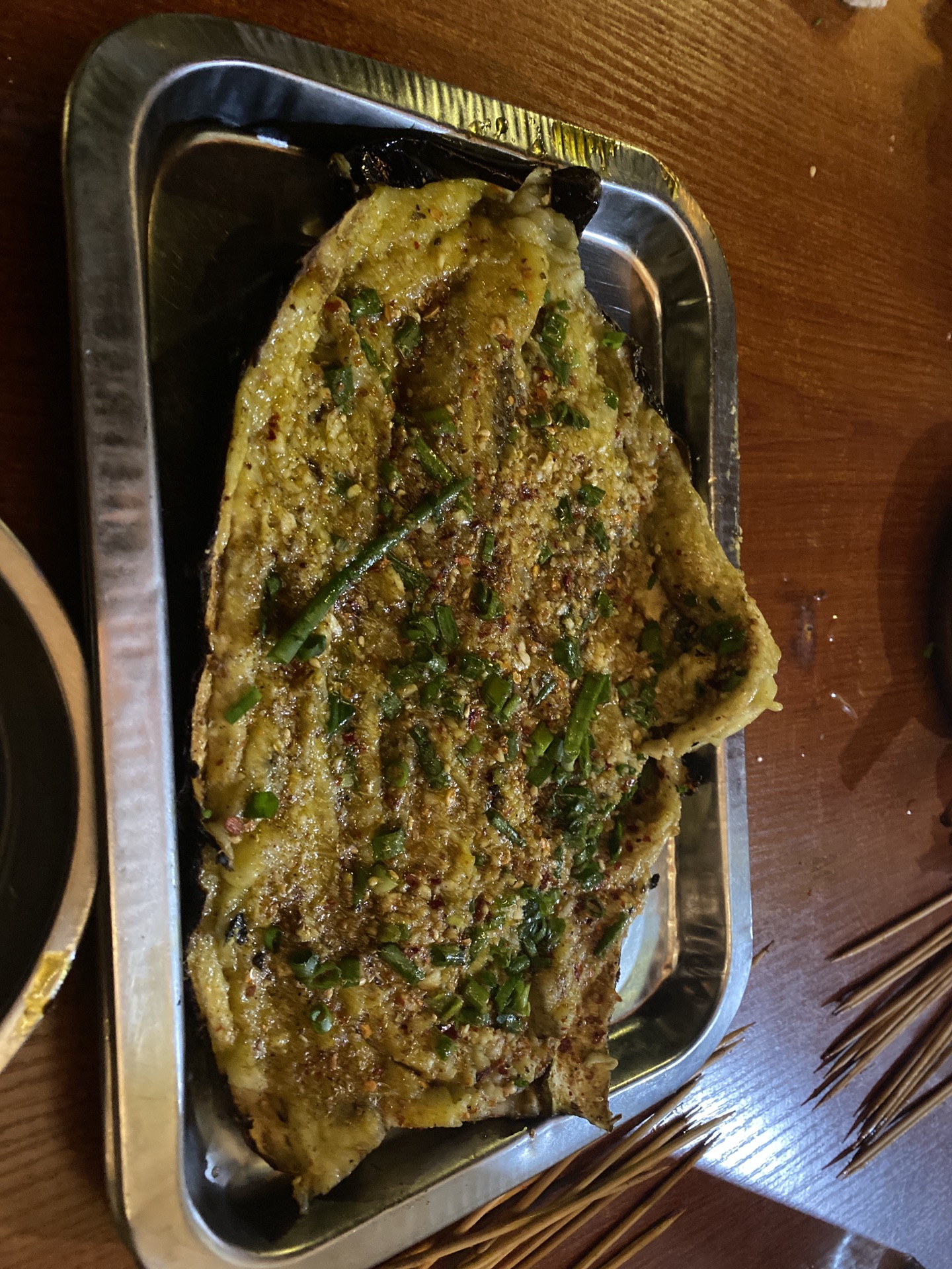 他家的茄子做法很特别,先是把茄子整个扔进火盆里烤,然后再在烤架上上料,时间大概等了半个小时,待茄子上桌,我已经浑身发抖了。人均大概60元左右。