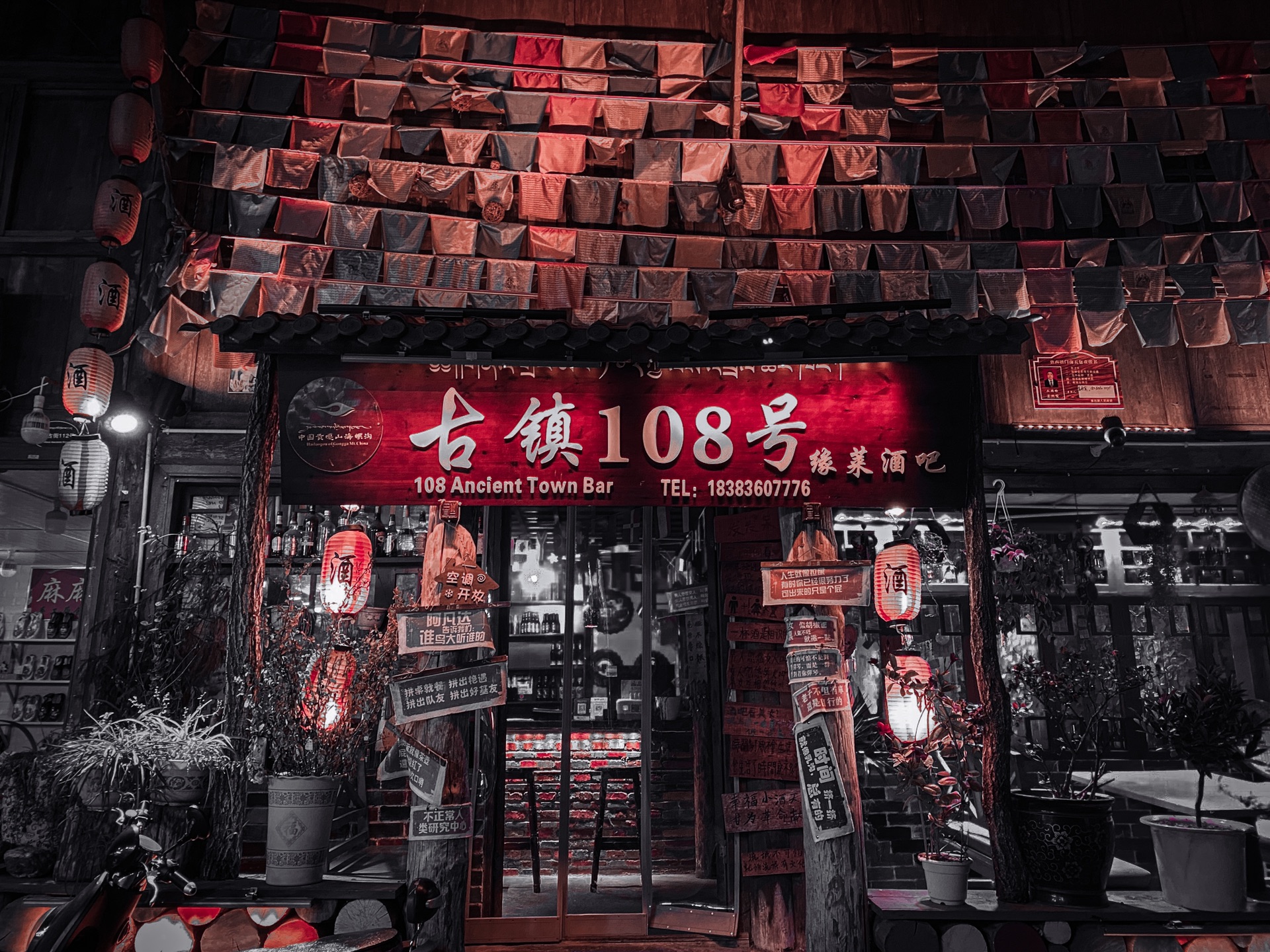 随后我们又碰到了 古镇 108 号,没有进去小酌一杯,只是不喜欢这家的装修风格,一路上ymy 一直在跟我和说:“我咋感觉这里是丽江呢”。“嗯,岂止是像丽江,难道你不觉得也像洪崖洞和成都的宽窄吗”。果然天下古镇是一家啊