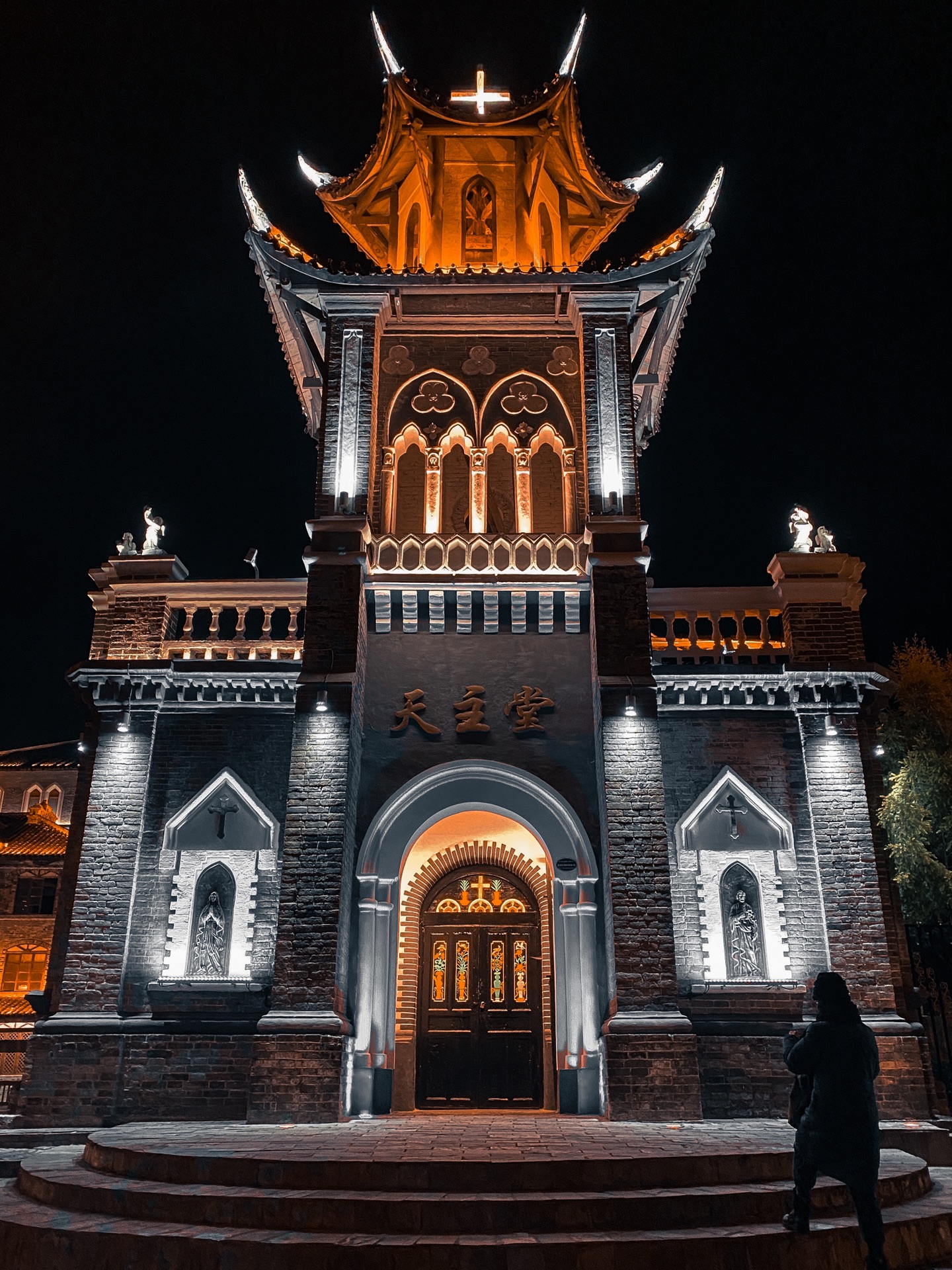 古镇最有特色的是在古镇的中心区域有一座法国传教士修建的哥特式教堂,天主大教堂,它所传出的礼拜祷告钟声已回响了一个世纪。我喜欢这种哥特式风格的教堂,充满了宗教的庄严肃穆感。