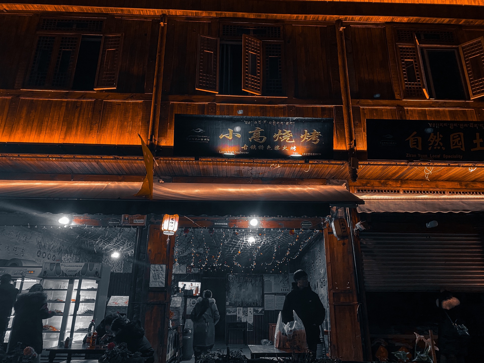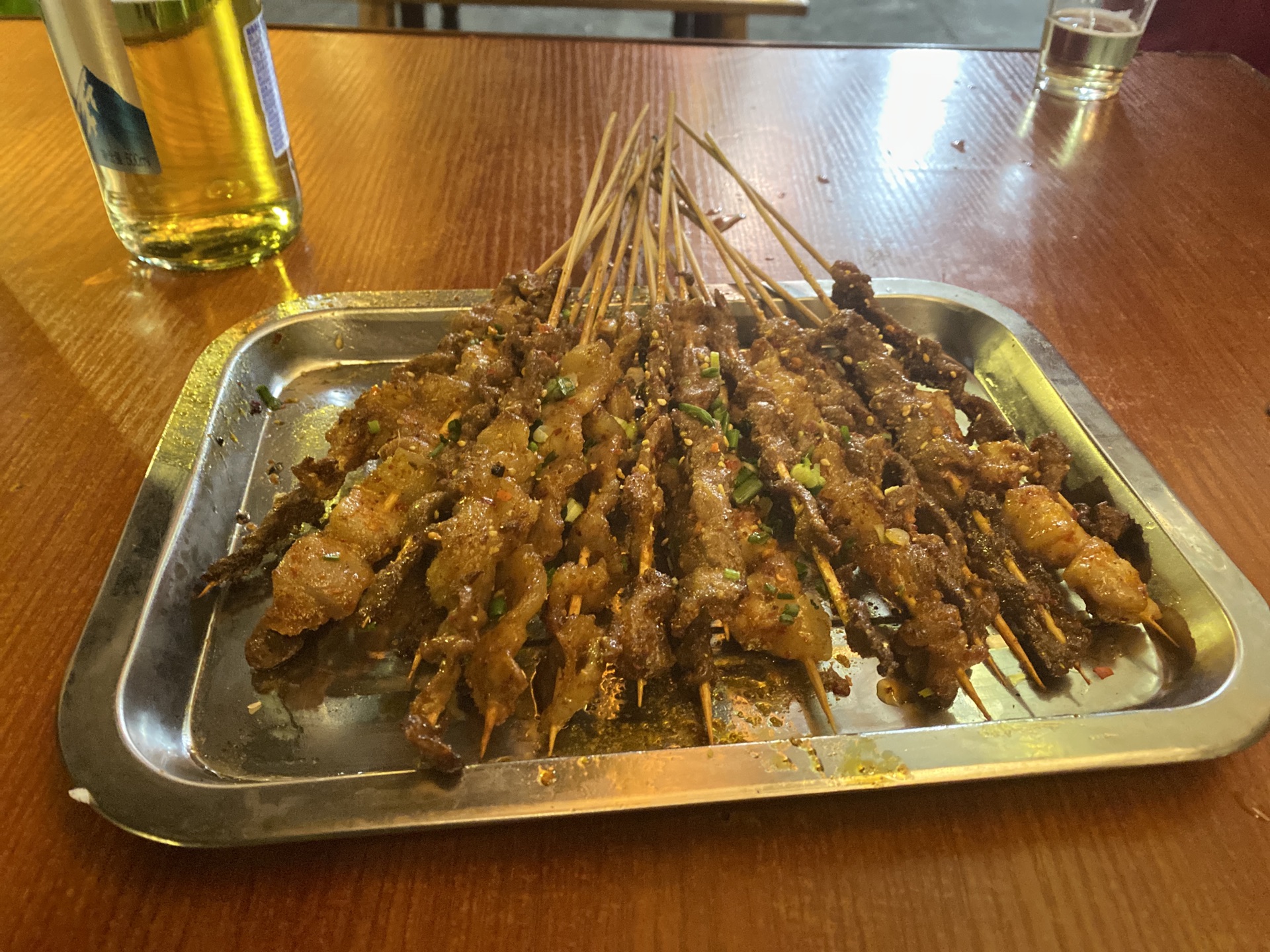 和一个吃货妹妹在一起,你永远不用担心自己的下一顿应该吃什么,别人早就给你安排好了。小高烧烤店面不大,就两个门面,木质的房屋外面是临街的走廊。当时是晚上 10 点 ,甘孜的温度 3 度,晚上凉风一吹,一股寒意侵袭全身。YMY 强烈要求坐在临街的走廊上,并且点了一瓶常温的啤酒。说是常温,但那个天气和冰啤酒没有什么区别。他家的烤牦牛肉真的好吃,有嚼劲且肉不老,我和我妹在这里吃了两顿,烤茄子是特色强烈推荐。