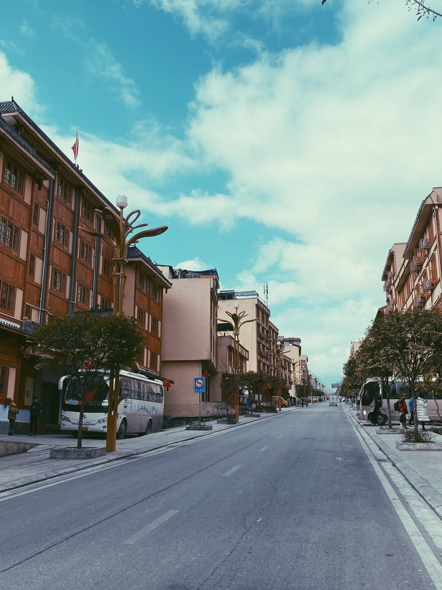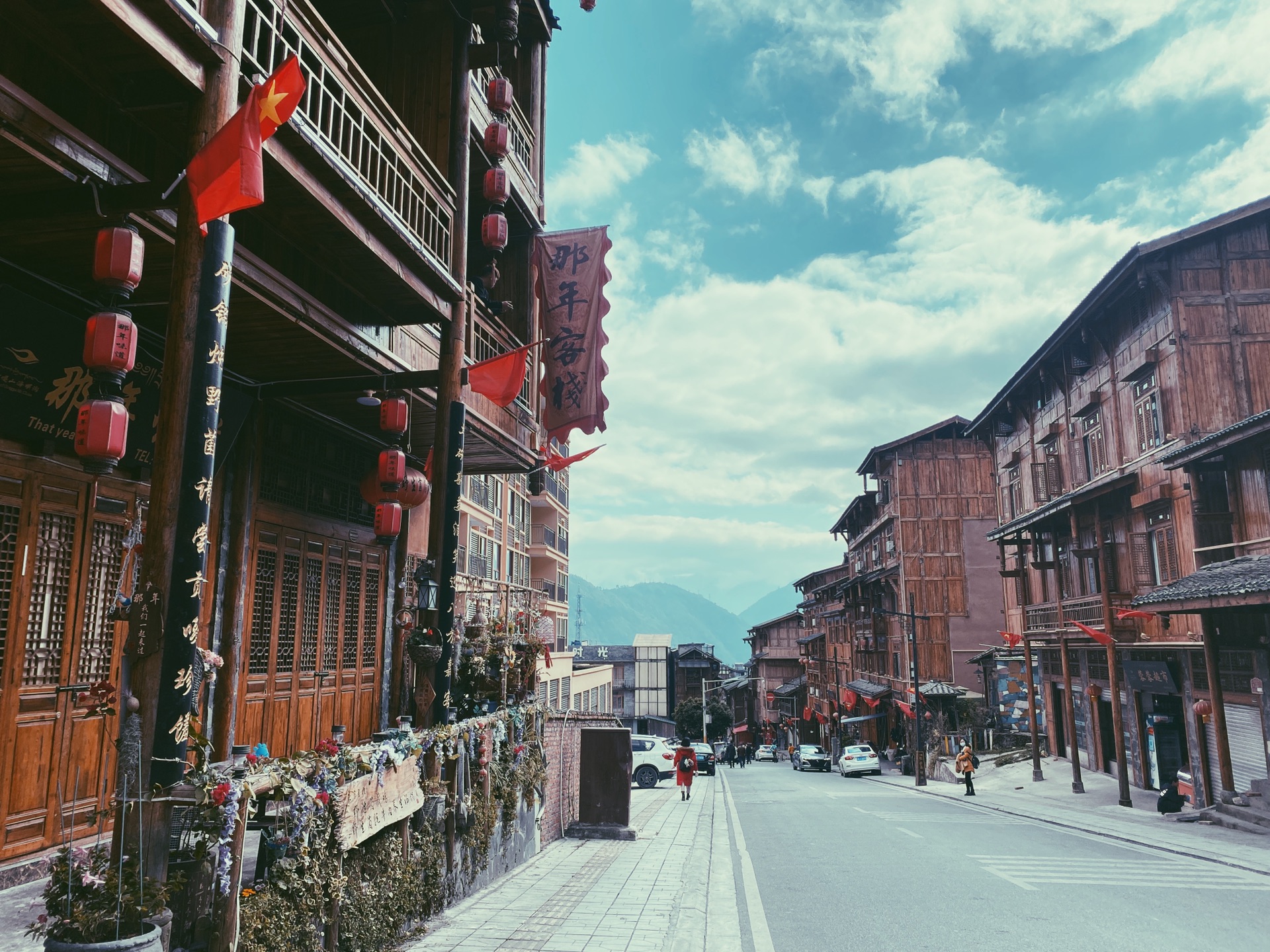 磨西古镇是此次川西之行的第二个景点,也是我的落脚点,所有的路线和规划都是以它为中心展开,最初了解这里是因为红军的磨西会议随后红军召开了飞夺泸定桥的计划,现在不仅因为红色文化,海螺沟的冰雪仙境让这里成为登山者和旅游的大本营,由此而出名。有蓝天白云的这张图片是我离开的时候拍摄的,看到图片里穿着红衣服的女孩儿了吗?就是我的小伙伴,我的妹妹,简称 YMY 后面我会陆续提到她的,也是一个自己不觉得尴尬,尴尬的就是其他人的奇女子。