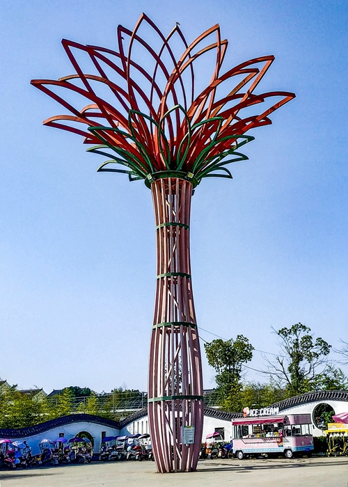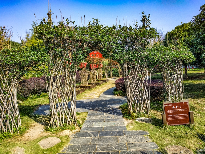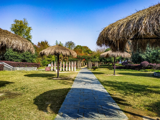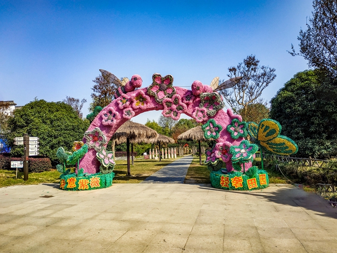 紫薇都市田园景区以植物编织文化为主题,建设有紫薇精品园林、紫薇文化博览、亲子互动体验、学生科普教育等四大功能区。进入大门,就看到一幅彩色的大门耸立在眼前,穿过彩色门,就来到紫薇精品文化区。在这个区域,可以看到用中国传统造园手法,建设了一座写意的豫章名苑,使游客能近距离接触到园林艺术的场所。