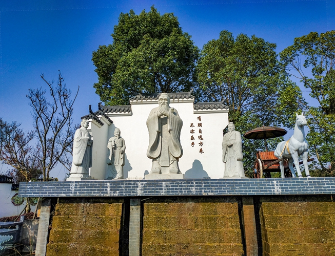 孔子广场,是为了纪念公元前497年,孔子率领子路、子贡等一众弟子周游列国期间,途径古代楚国今武汉新洲区的夫子河-问津书院-孔子河-孔子埠-仓子埠而新建的。