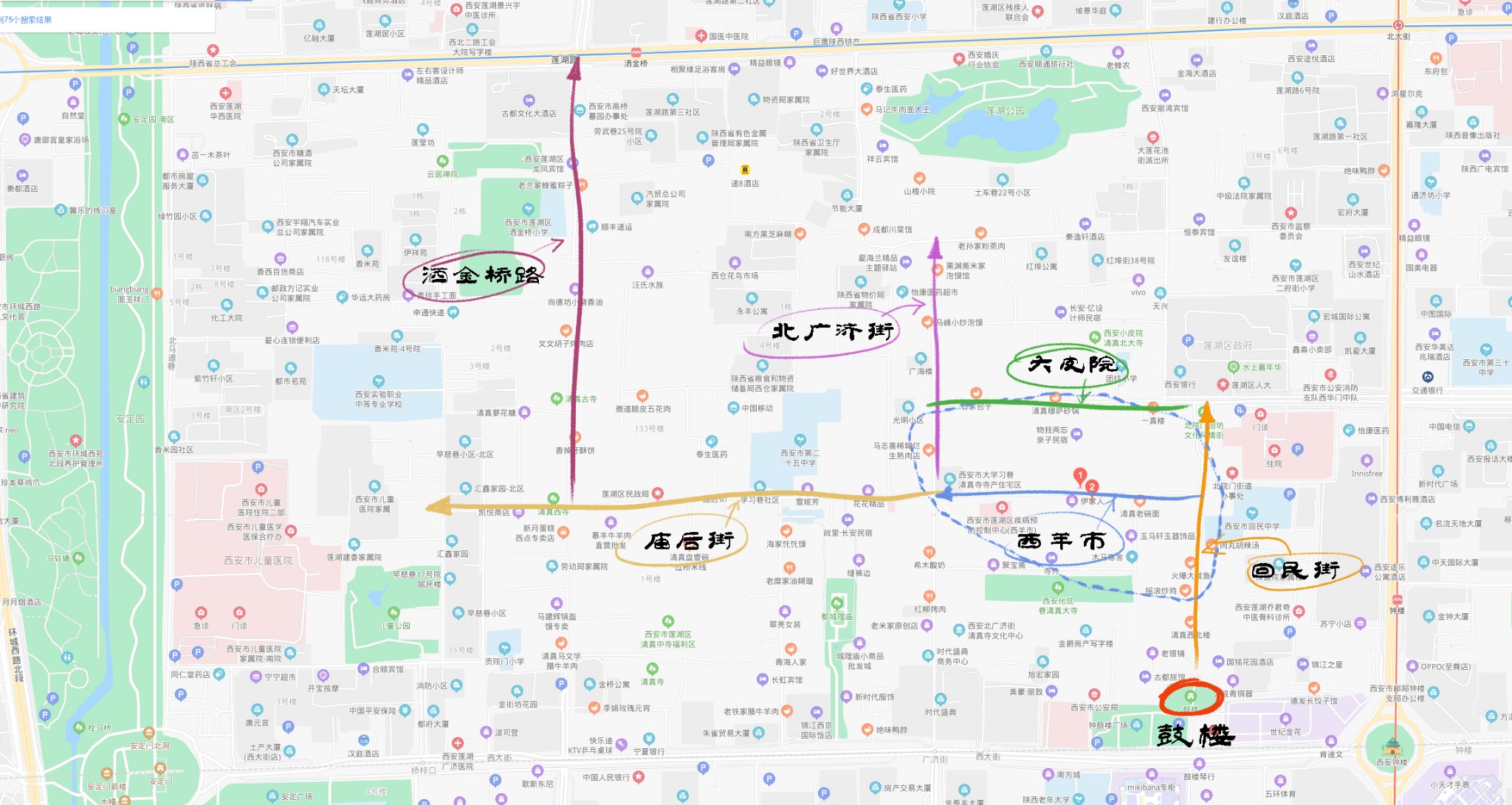 从上图可以看出五条街皆处于碑林区同一个片区域里且基本首尾有相连,通常以【鼓楼】或者【洒金桥地铁站口】为起点一路吃下去即可