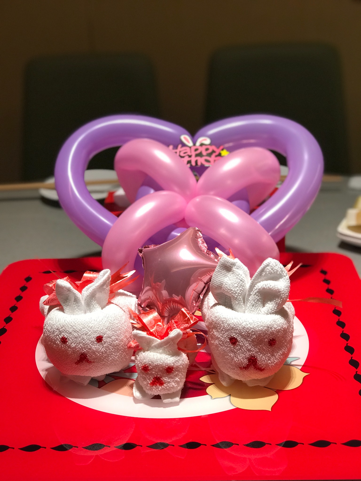 桌子最中间还特别有心的摆放着餐巾叠成的三只可爱的小兔兔~(如下图)