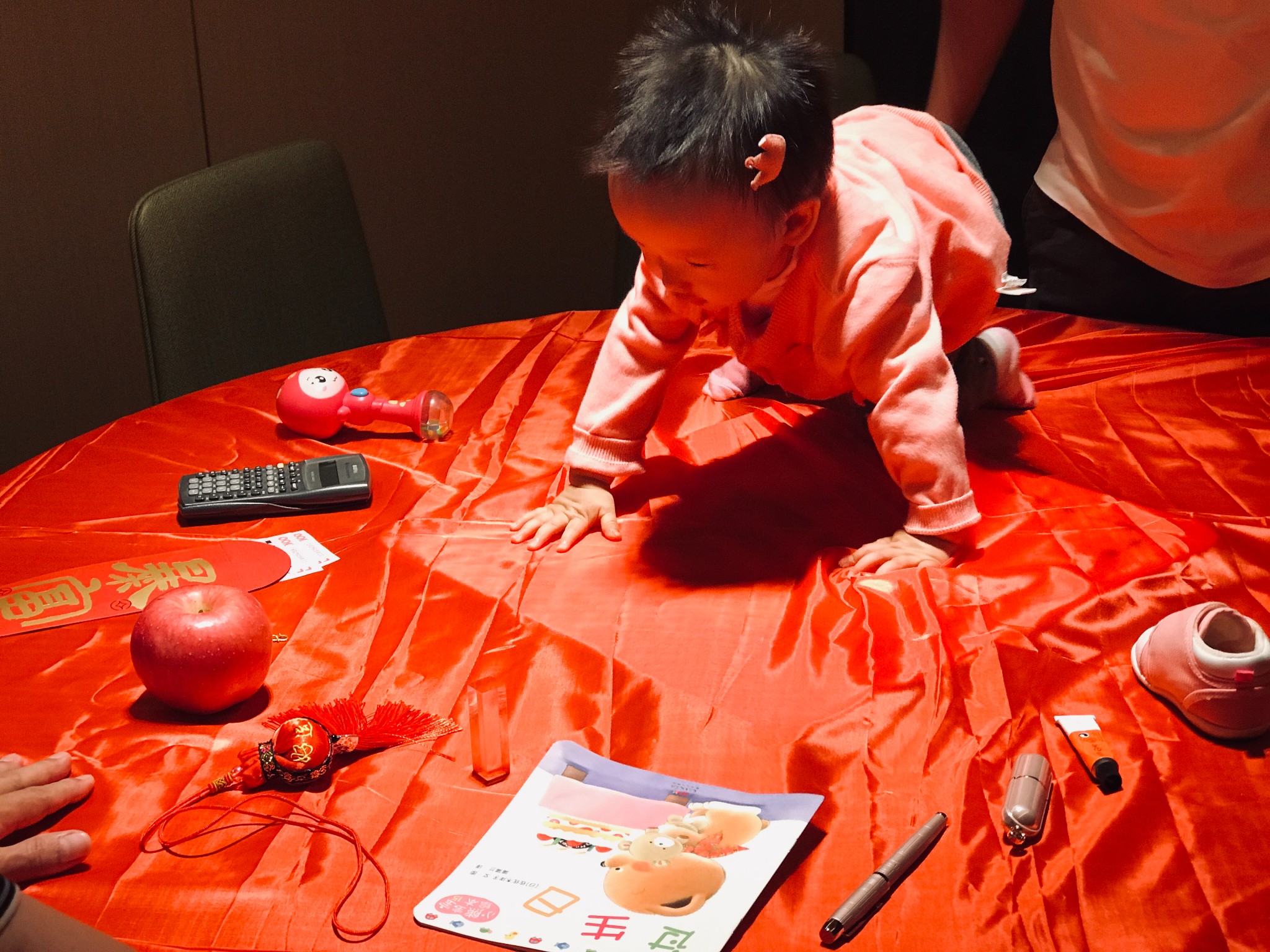 宝贝儿就在6个最亲的人的注视下开始了她的抓周表演。
