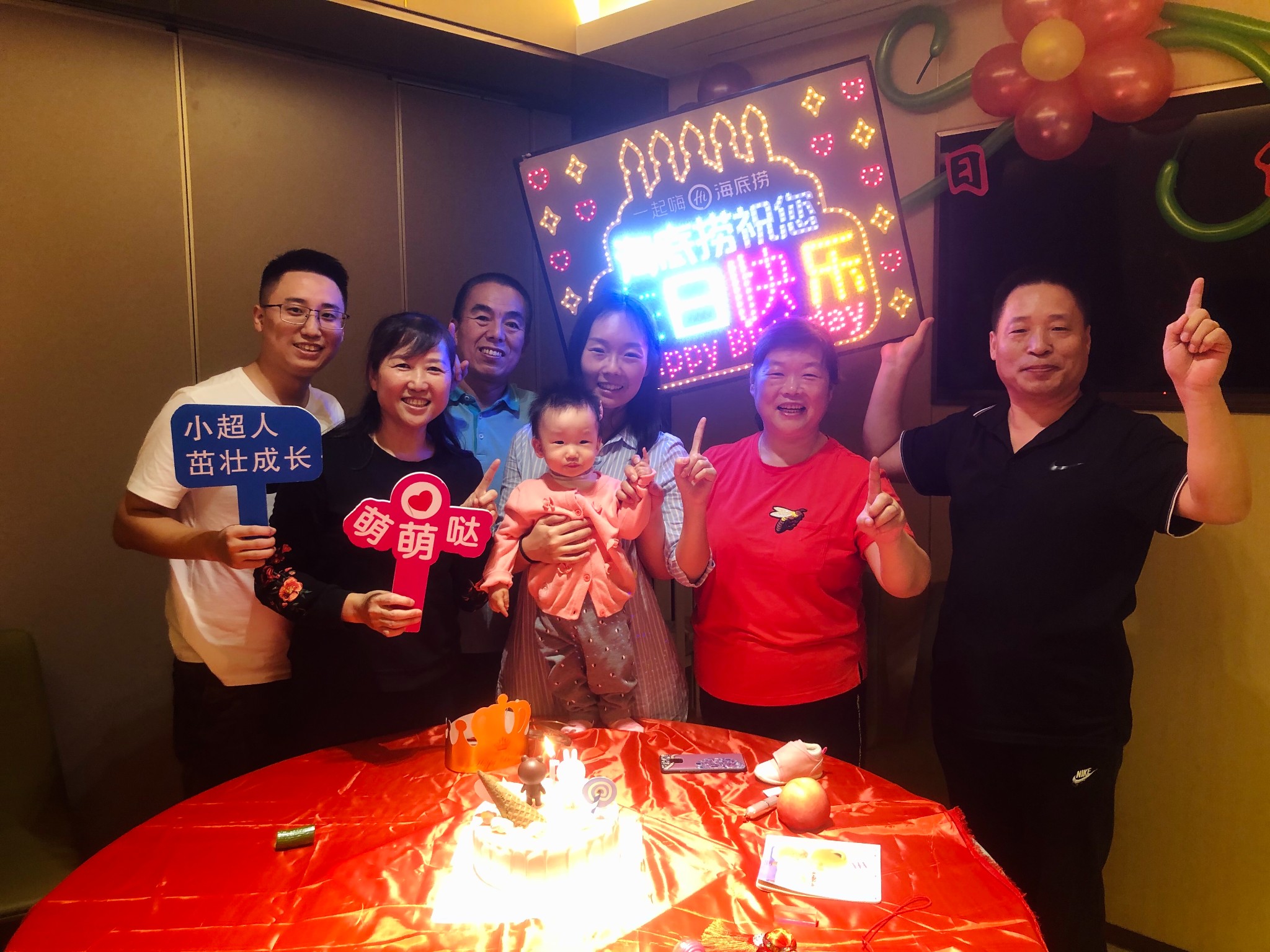 灯牌、立卡、音乐、服务人员齐唱的祝福歌声,甚至给宝贝的各种小玩具和”1“岁的大辣椒玩偶,