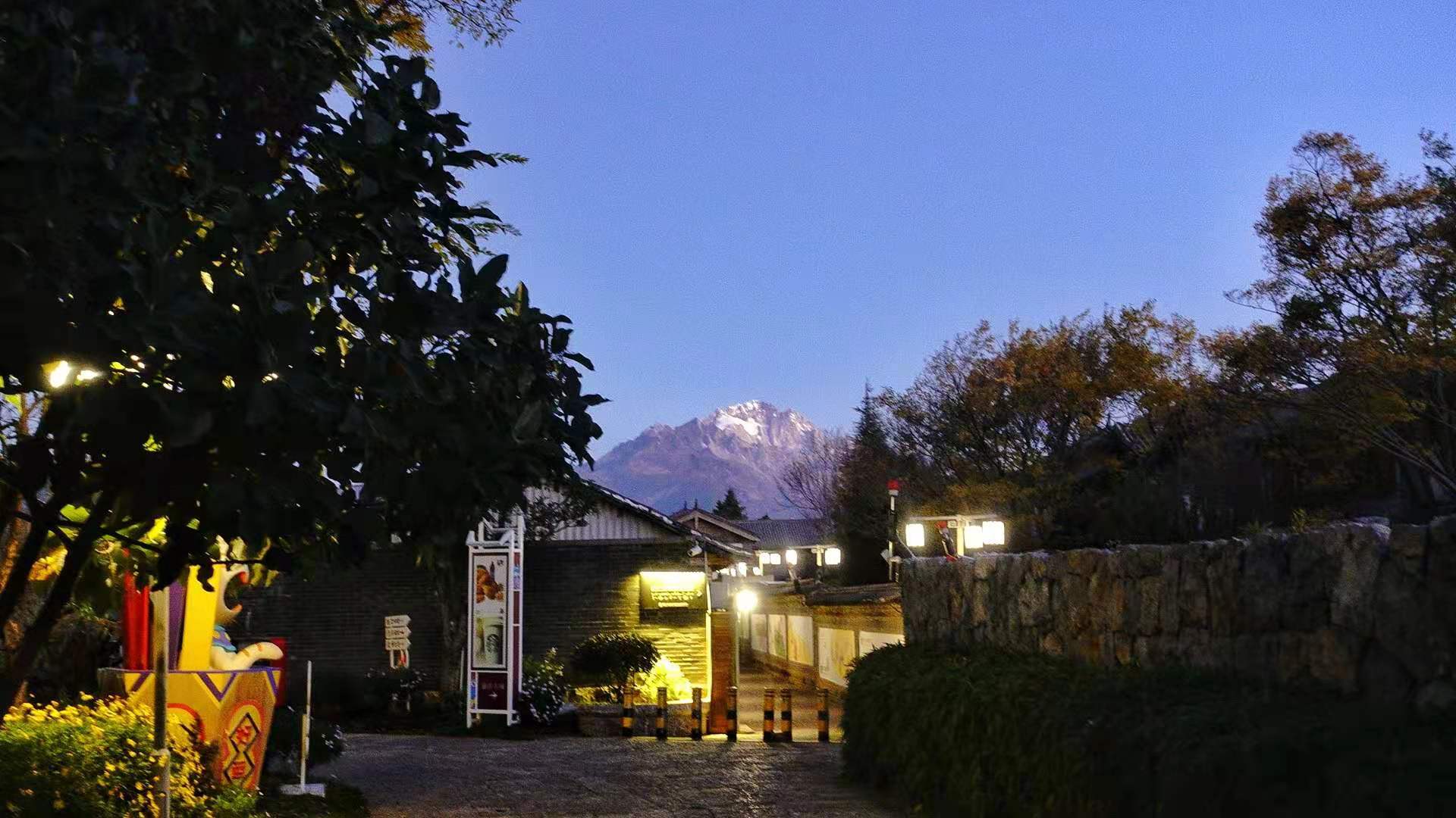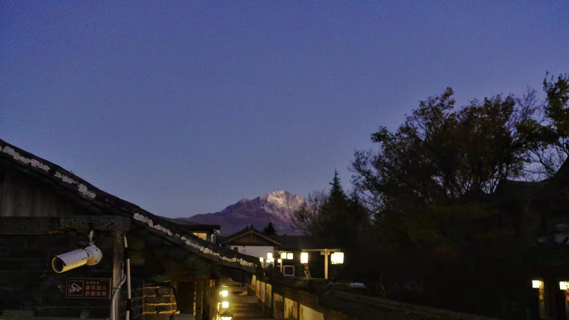 吃完回欲房间休息,此时已经逐渐天亮,抬头看去,太阳已经开始照耀在北方的玉龙雪山上,从古城望去,别有一番味道。