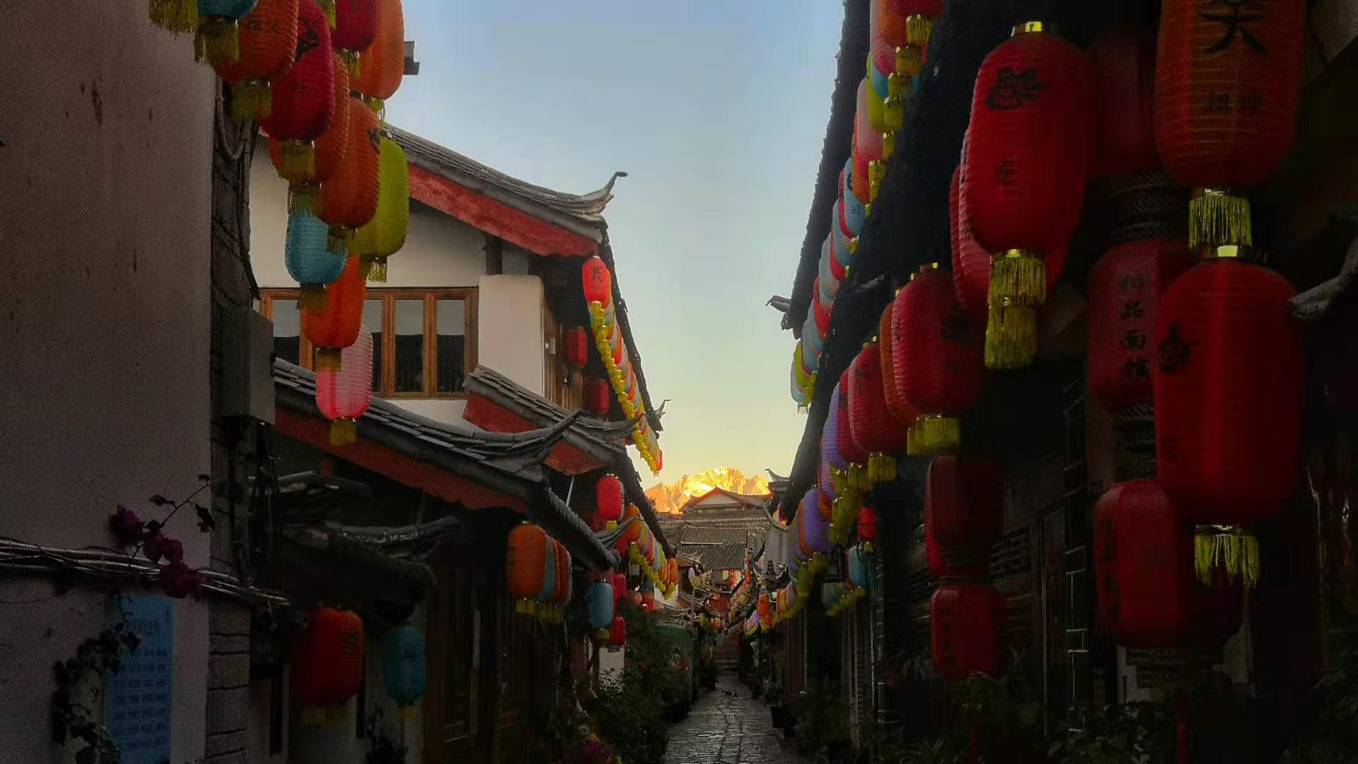 早上是可以在古城直接看到雪山的,看到阳光照射在雪上顶上变的金灿灿的,还是很美的。