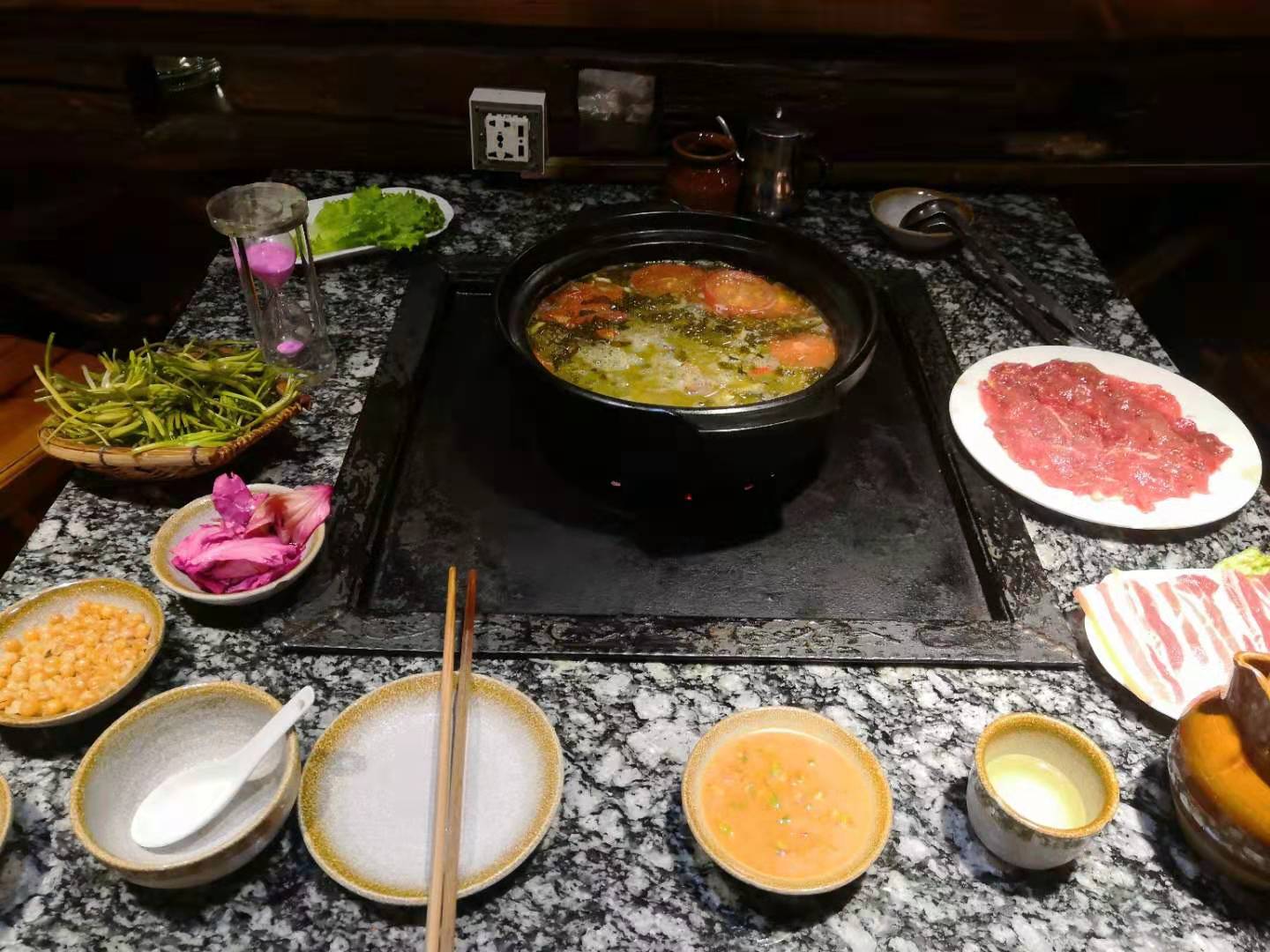 到了晚饭时间,去了一家很有当地特色的饭馆——菌珍宴,特色是可以同时吃到腊排骨火锅与石板烧。去店里的路上还发现了一处很美的地方。