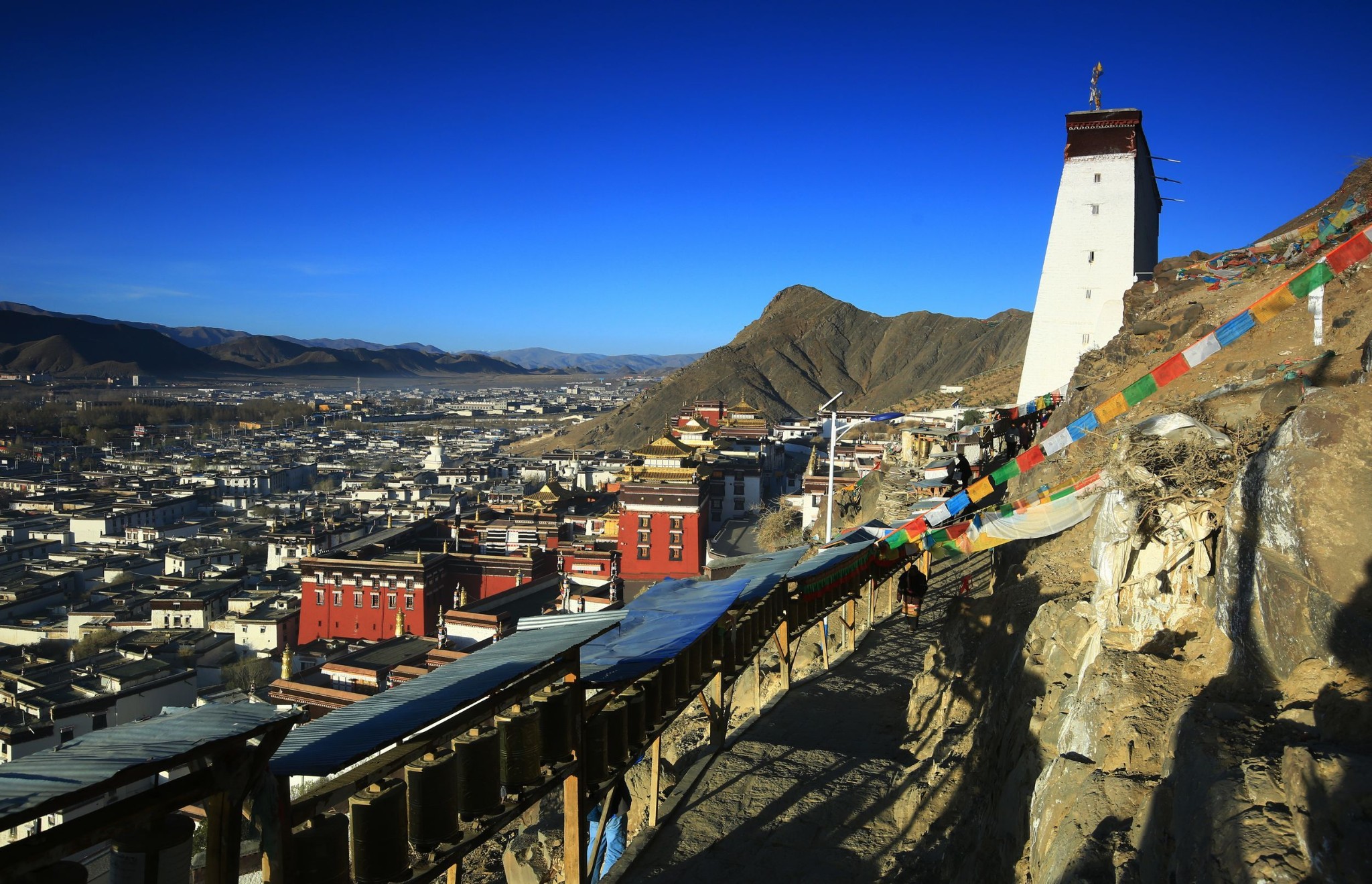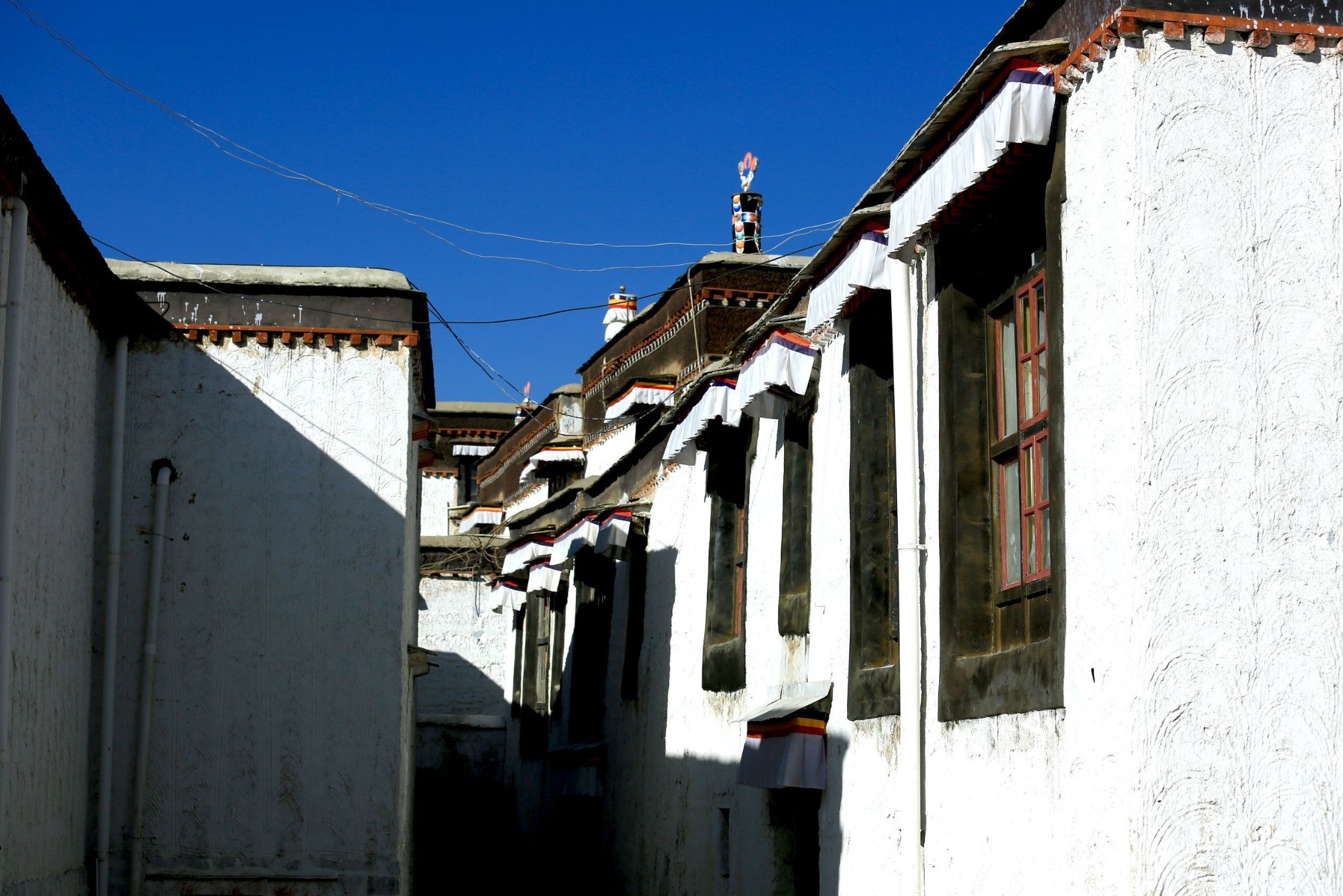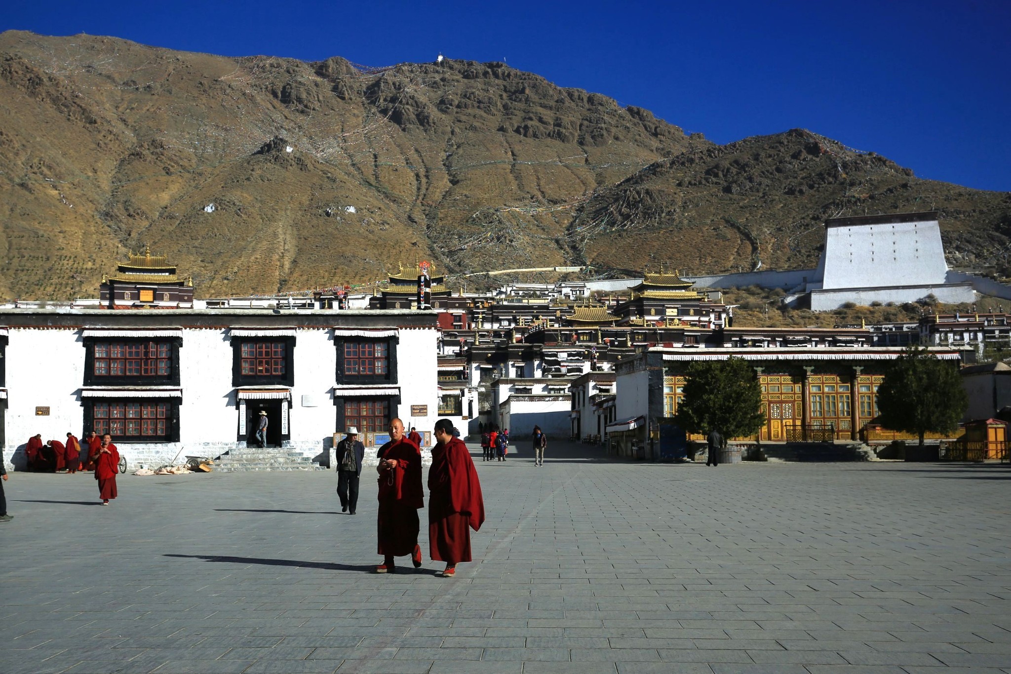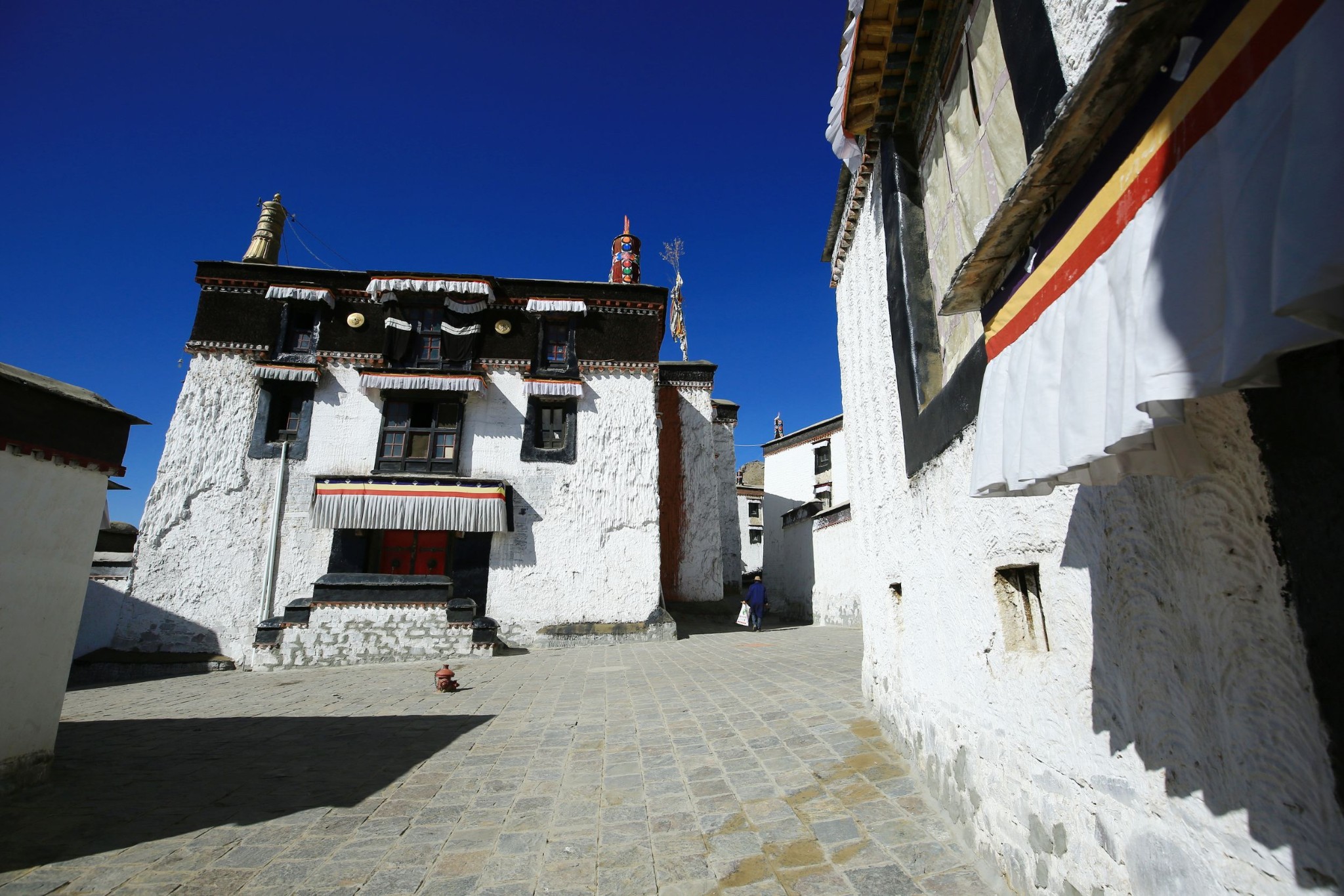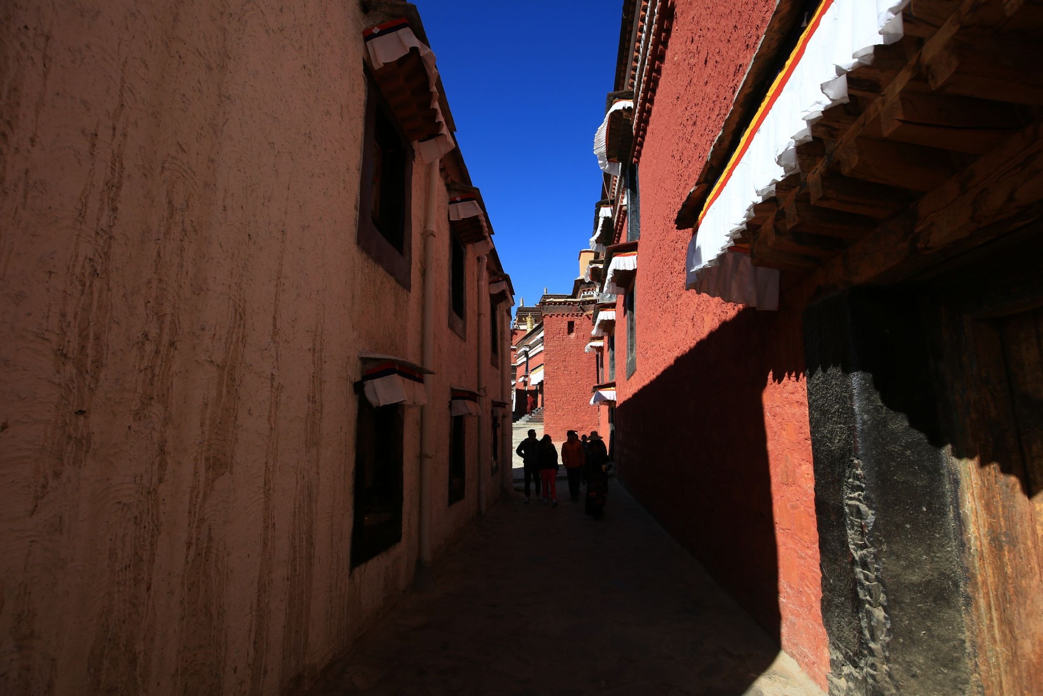 由于饼干联系了寺院里的一个喇嘛当我们的导游,所以我们一行可以提前半小时进院参观。这时游人比较少,走在朝阳斜照的寺院巷弄里,感觉就像一脚踏进了欧洲的某个古老小镇,一脚来到了一个真实存在的寺院建筑博物馆,这里散布着红白相间的房屋与殿宇,随处可见精工巧匠们建造时的艺术激情,偶见早起的喇嘛从面前穿过,清净致远。