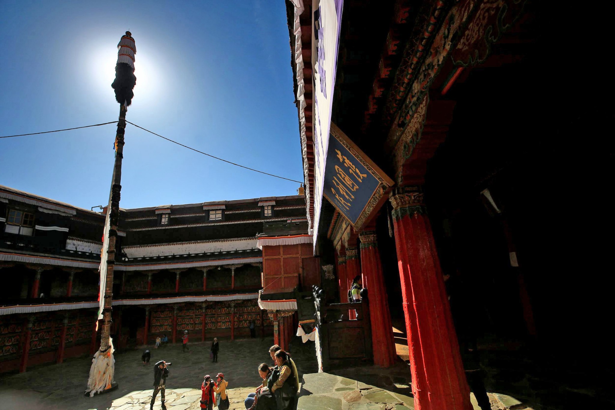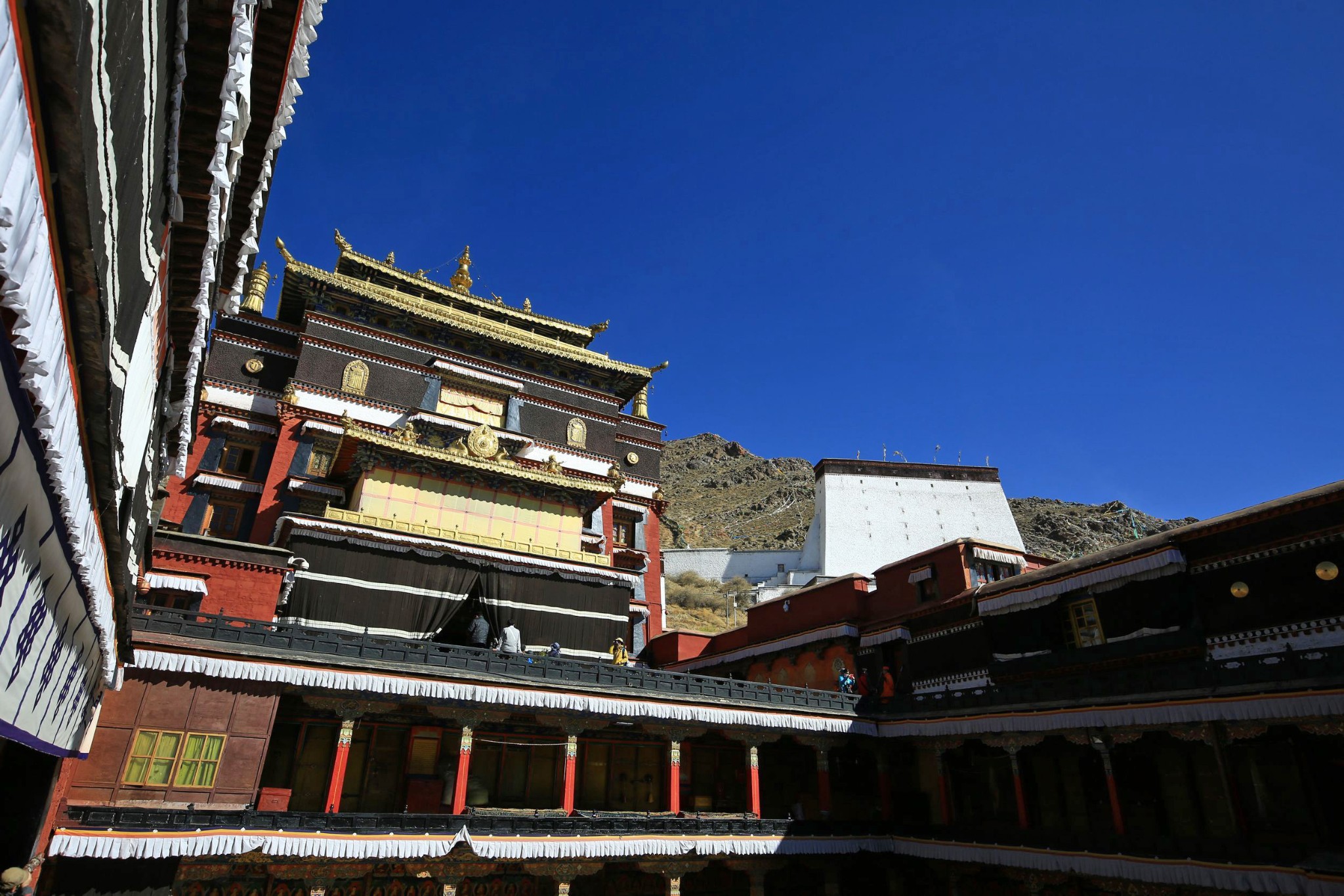 不巧的是,我这次碰上大经堂(即错钦大殿)正在装修。据说它是扎什伦布寺最早的建筑,历时12年建成,大经堂前,有个 600多平方米的讲经场,这个场是班禅对全寺僧人讲经及僧人辩经的场所。