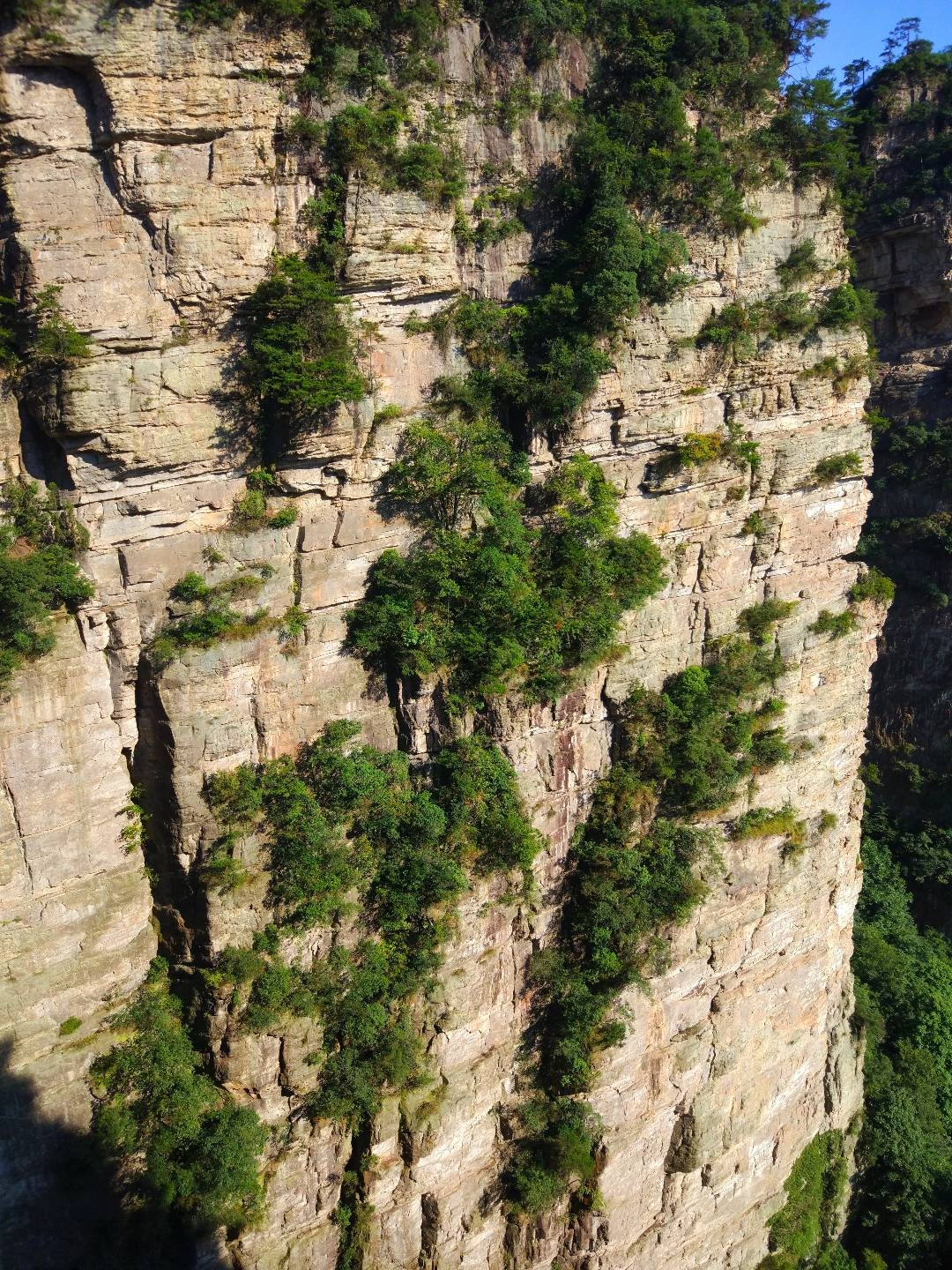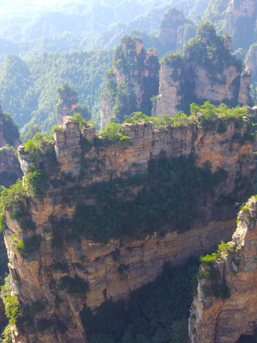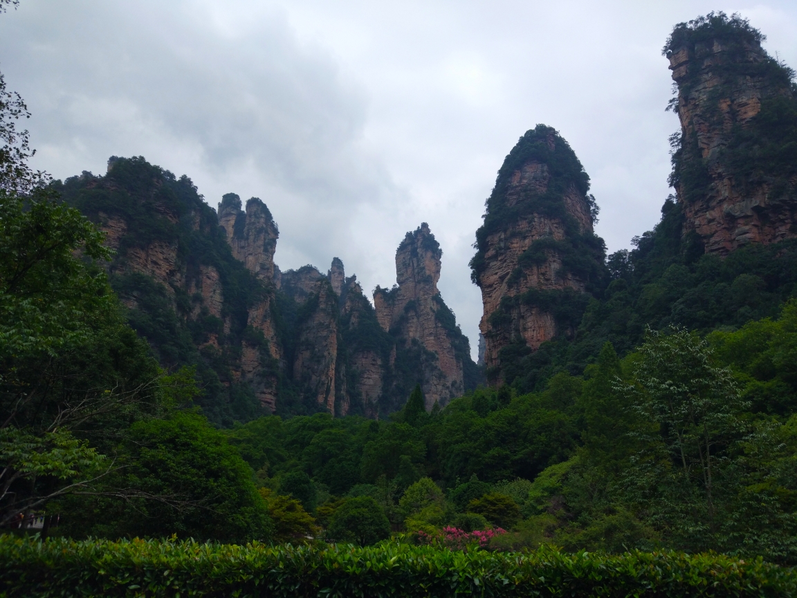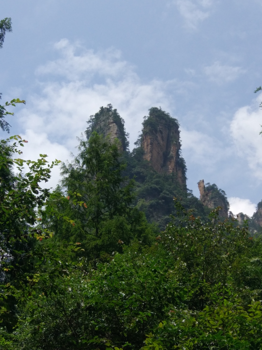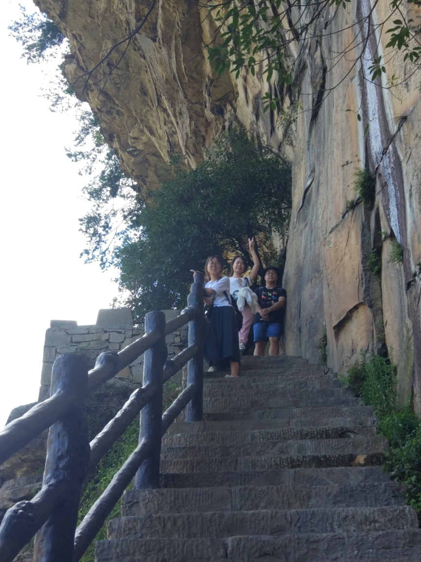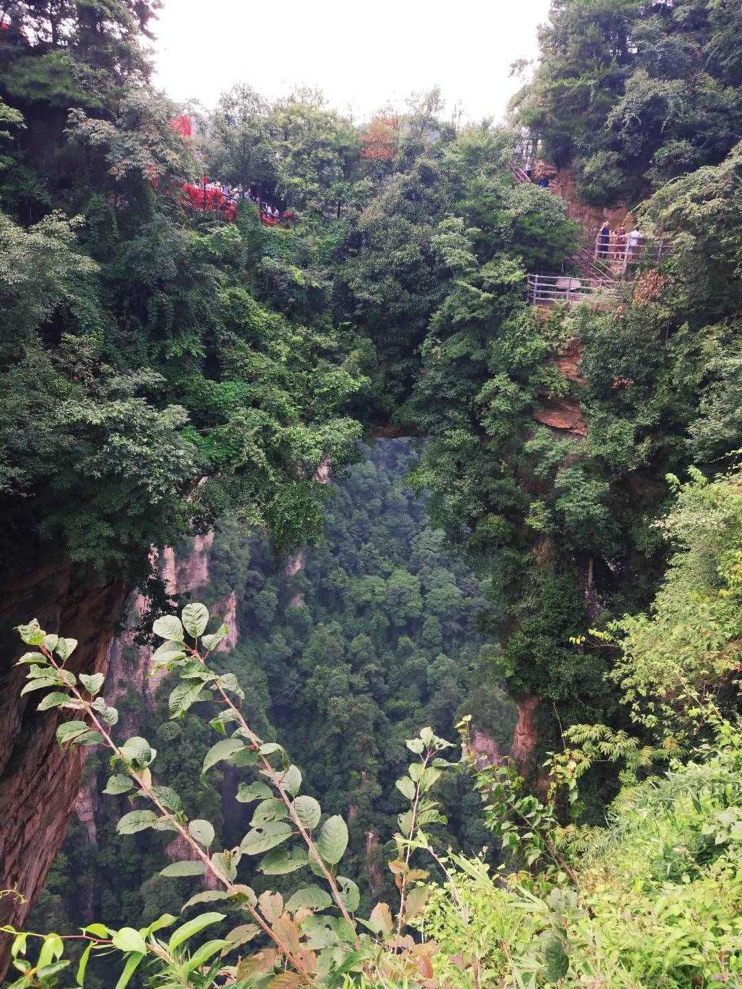 然后搭乘百龙天梯上去,刚从电梯出来就开始下雨,又找不到地方避雨,买了两件雨衣,一会儿天又放晴了––第一次体会到山区的阴晴无常。