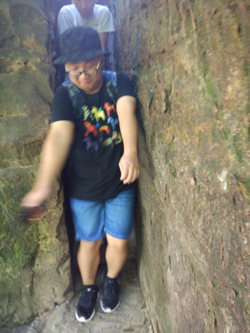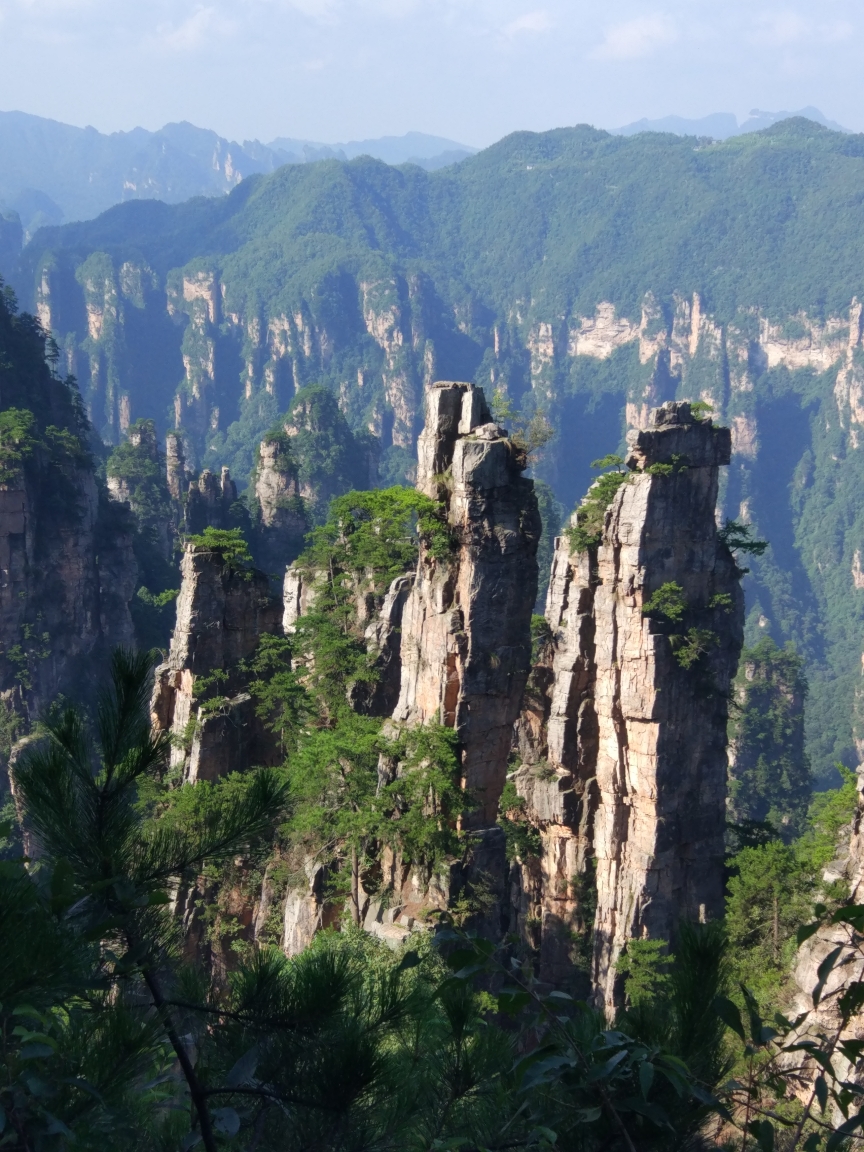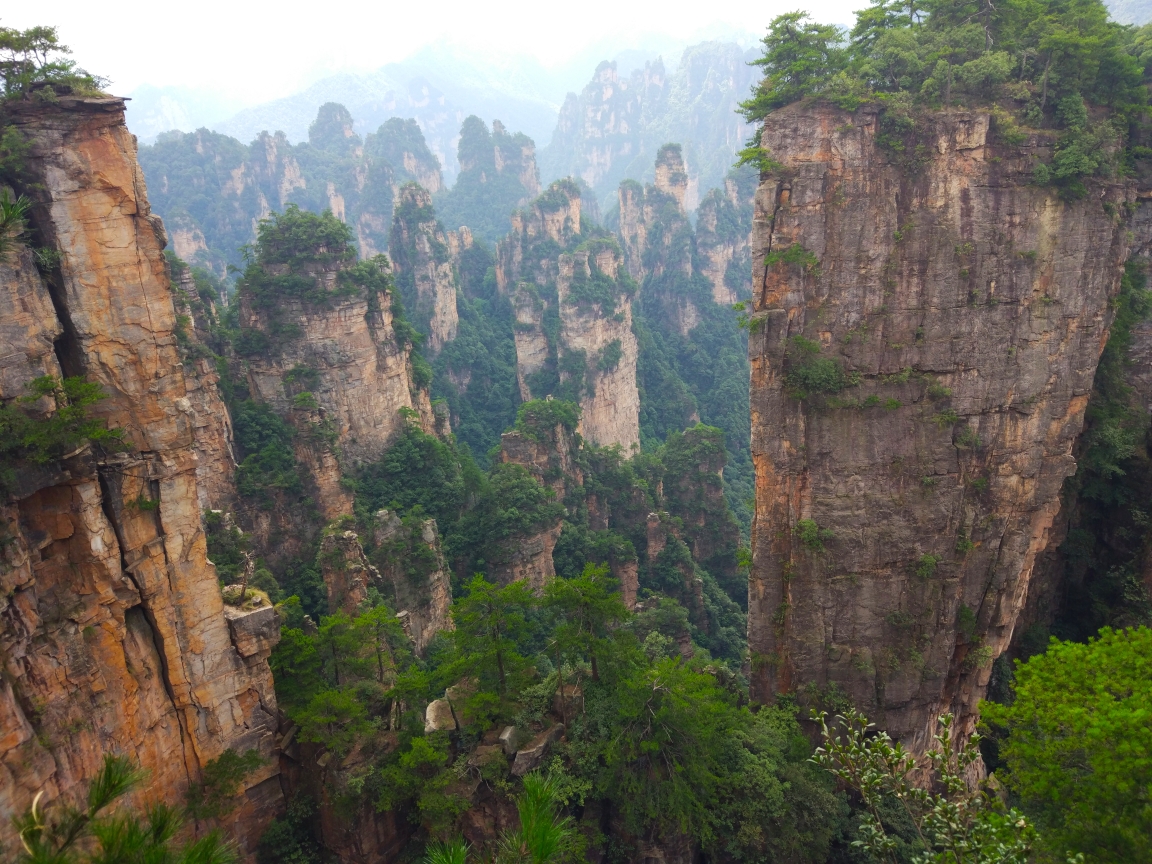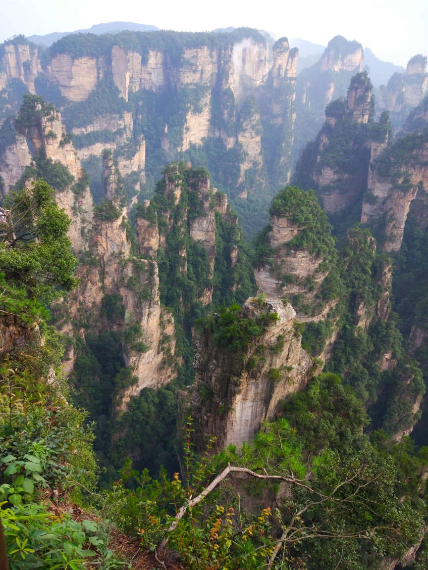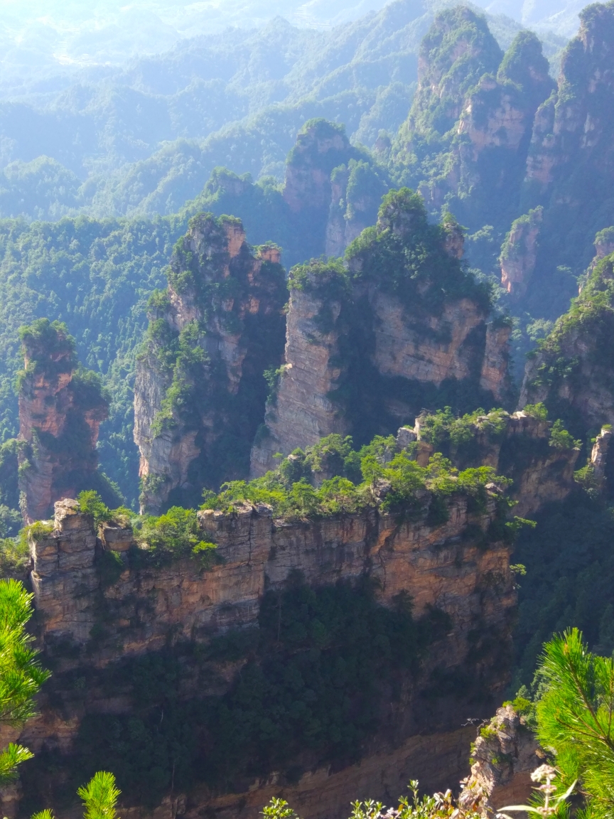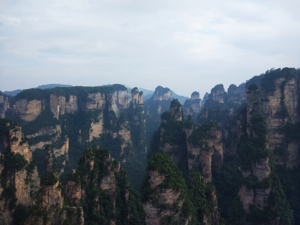 然后搭乘百龙天梯上去,刚从电梯出来就开始下雨,又找不到地方避雨,买了两件雨衣,一会儿天又放晴了––第一次体会到山区的阴晴无常。