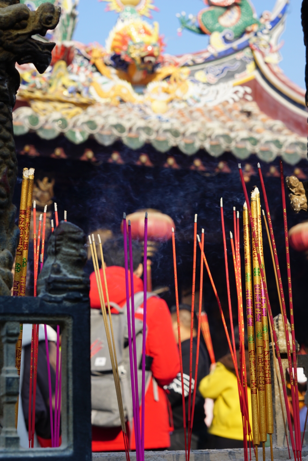 寺内2元就可解签,据说这里求签很灵,尤其是求姻缘超灵。我这个单身大龄剩女以前从来不信这些,此刻也是很想算上一签。奈何站那半天就是看不懂这求签的步骤,看人家又是摇签,又是摔木块的实在是很疑惑,只能作罢。后来和当地人聊天得知,正常的求签流程是先将筒子里的所有签子摇一摇然后抽一签,抽完先把签先拿着。然后拿起签筒边上的两块木块。这两块木块是拿来打卦的。先拜拜,跟关帝爷说下你抽到是哪个签(签上的数字),现在想要知道这签是不是你的。把木块扔到地上,如果朝上的两面都是一样的要把抽到签放回去重新抽一个,如果是一正一反的,那就可以拿去解签处解签。解签处解签每签是两元。然后到解签处说签上的数字。解签员会马上把签诗给你,人不多时还会多讲一些。没有求到签也算是此次的一个小小遗憾吧。