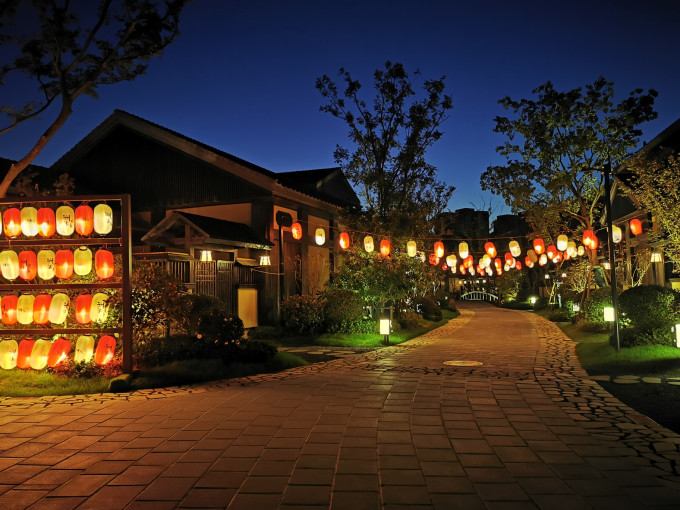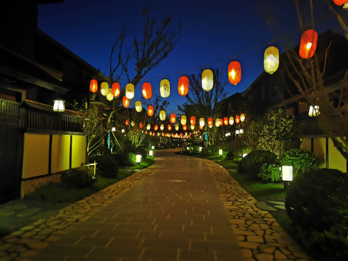 入口进来一条漫步的小径,两侧排列着数栋传统仿唐的建筑群,空中悬挂着灯笼,点缀树、松、枫、石、桥入画。尤其夜晚看起来十分迷人,仿佛从现代遁入古代。行走在这里,方能体会不虚此行的魅力。