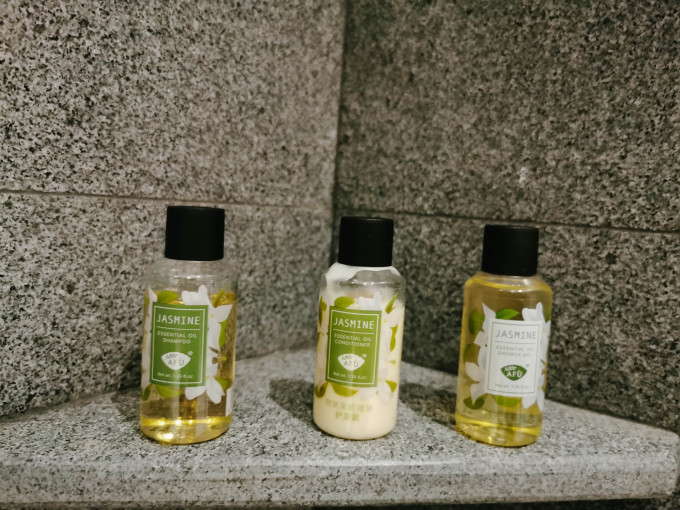 沐浴用品是AFU小样,洗完澡适量涂抹润肤乳。