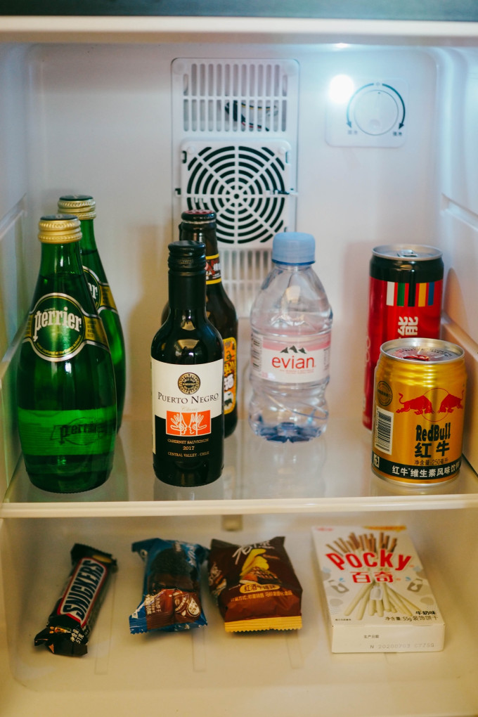 mini冰箱里的统统免费,除了常见的饮料外,还有进口啤酒,矿泉水,红酒,气泡水等,以及各类的小零食(薯片,百奇饼干,士力架)等。