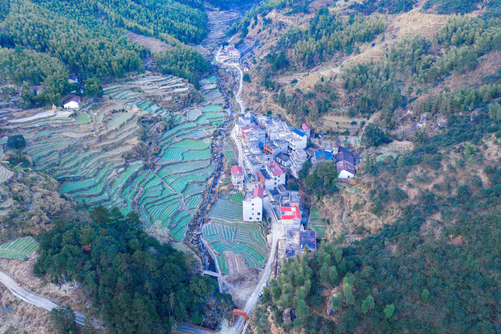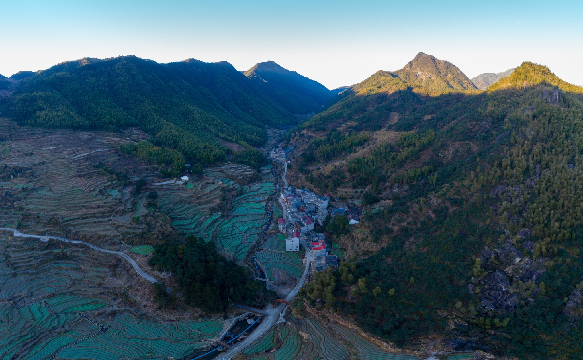 翌日,阳光还未洒进山谷,便爬起来航拍。无人机镜头下的葛路比想象中还要美三分。最高处竹海覆盖山头,充满原始野性气息,山腰上一层一层梯田一直延伸到谷底。民宿的位置刚好在在半山腰,这意味着打理农田还是回归原始森林都很方便。