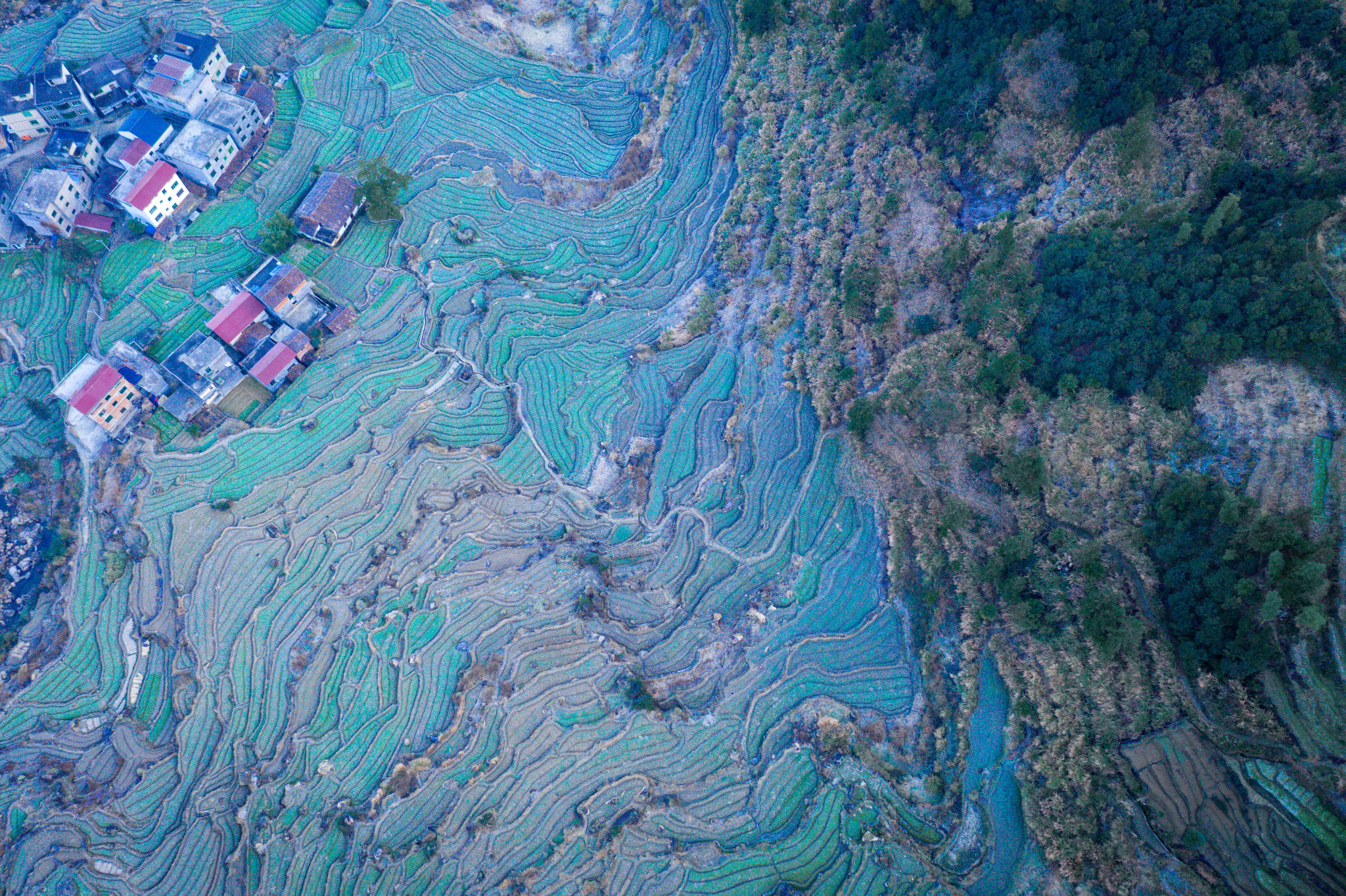 葛路梯田展现了最原始的农耕生活形态,只是它的风景要比黄河流域的那些小河农耕漂亮很多。小飞机在400米高空拍到山谷全貌,画面像一台精致的盆景。