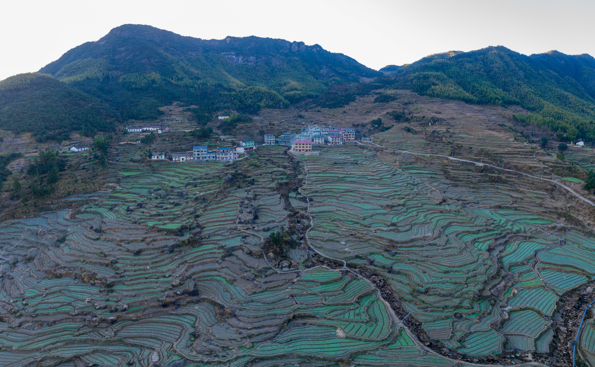 望仙那么多好看的地方,唯有葛路梯田成为气候。这完全归功于奇特地形。簸箕型山谷中,清泉从崖壁石缝隙中缓缓流出,人们顺势将山坡梳理成台阶,像盘子一样承接清泉。溪水在滋润过梯田之后,在村口汇成河流,蜿蜒流向大济八卦村。