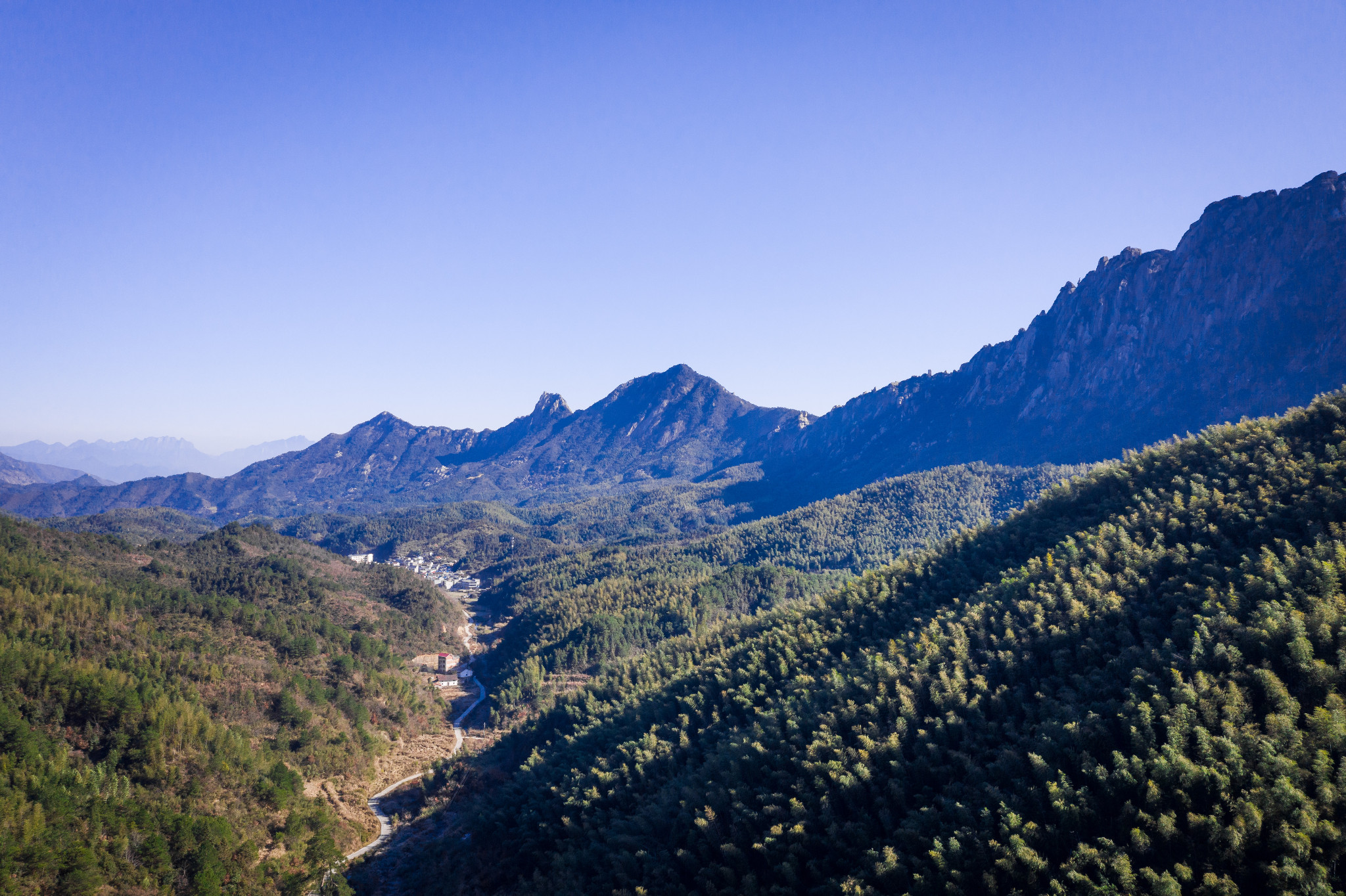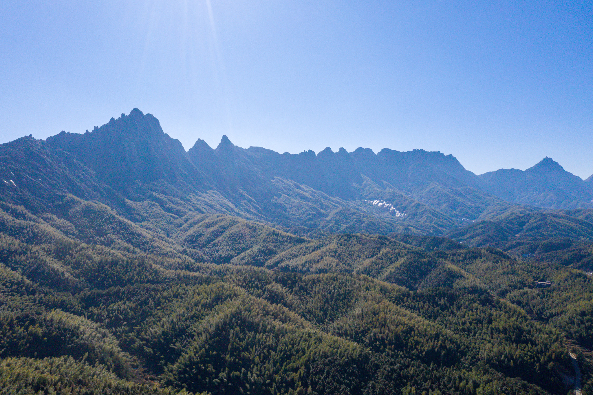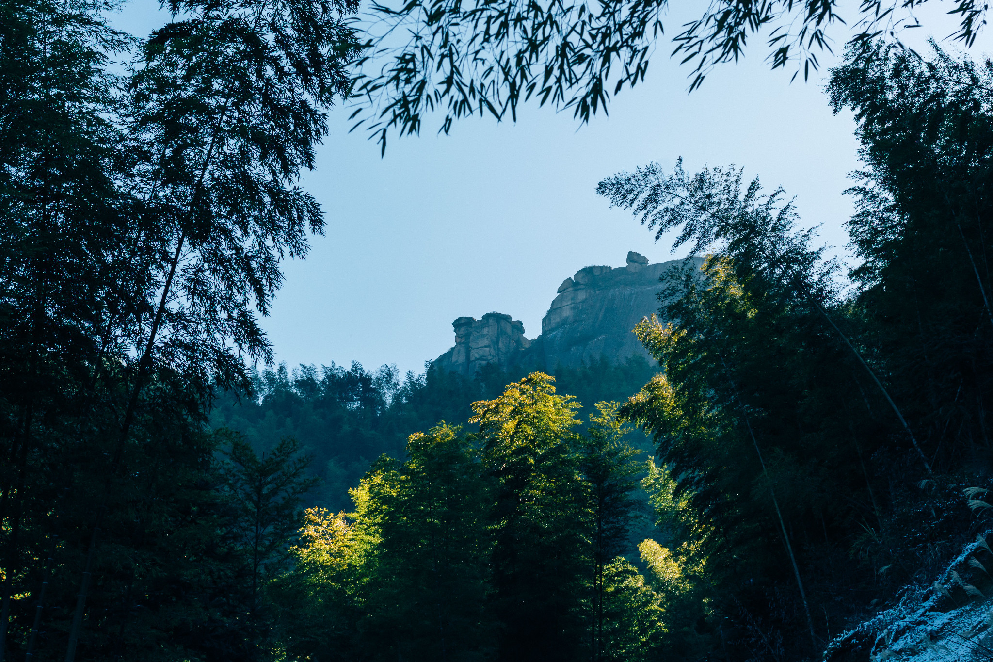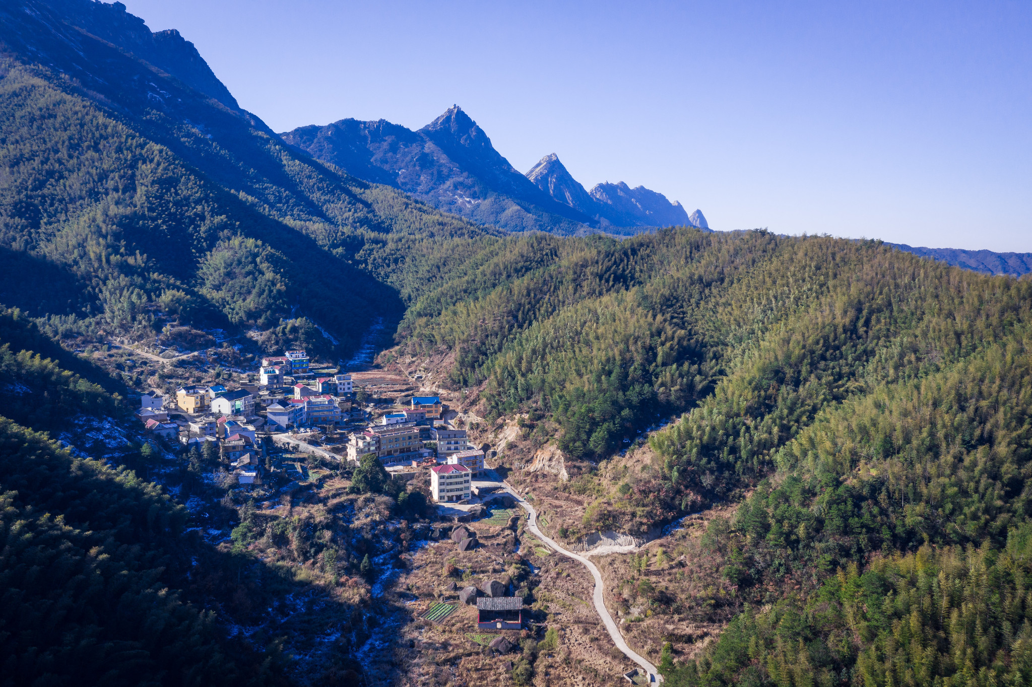 卫星云图俯瞰灵山72峰更像弦月。高南峰村就在弦乐腰部。奇峰异石像天神一般,在这座村落上方投下阴影,山脚下幽深浓密的竹林似乎长了上千年,阳光下反射墨绿的颜色,显得神秘难测。
