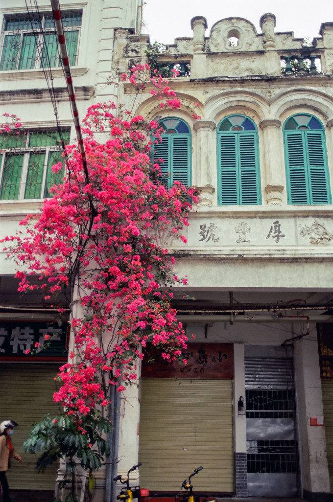 在酒店二楼的凉台可以俯瞰整个中山街,而中山街则和得胜沙路、博爱路、新华路、解放路、长堤路等一同组成了骑楼老街区,而这洋洋洒洒覆盖了二平方公里的老街区则形成于民国时期,最早在南洋谋生的人们回到家乡,把当地的建筑风格装饰带到了这里,从而形成了现在看到的骑楼老街区