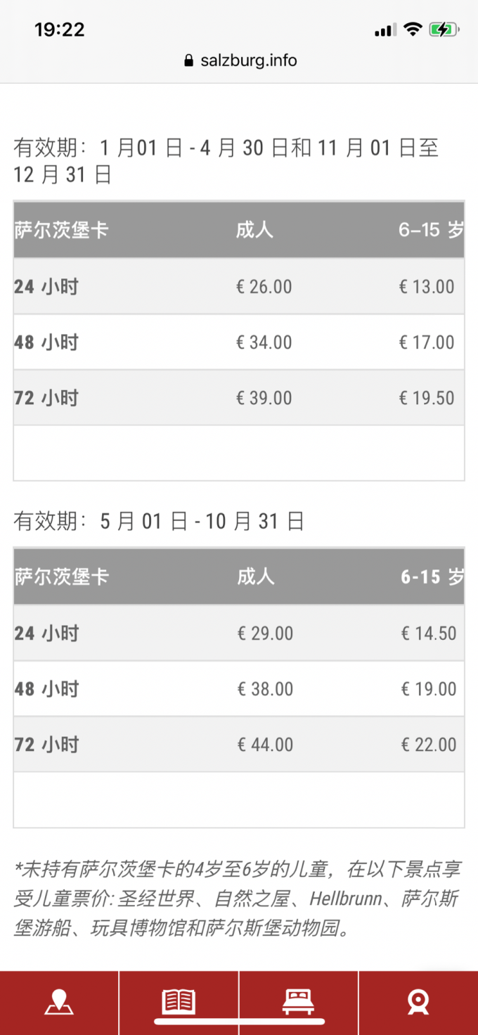 萨尔茨堡卡优惠一览:免费单次参观所有景点和博物馆;免费搭乘公共交通(包括城堡缆车、温特斯山缆车、僧侣山电梯、盐河游览船);诱人的文化活动和音乐会折扣;众多郊游目的地的额外折扣;无需在售票处排队,部分景点可以走快速通道。可以直接在官网在线购买数字萨尔茨堡卡并保存在智能手机上,中文网址https://www.salzburg.info/zh/hotels-offers/salzburg-card,也可以在各酒店前台,旅游信息咨询处和机场购买。萨尔兹堡卡分为 24、48 和 72 小时。具体淡旺季价格如下: