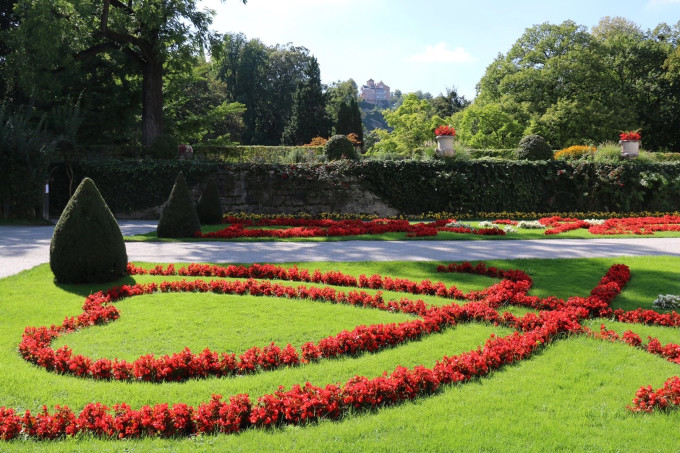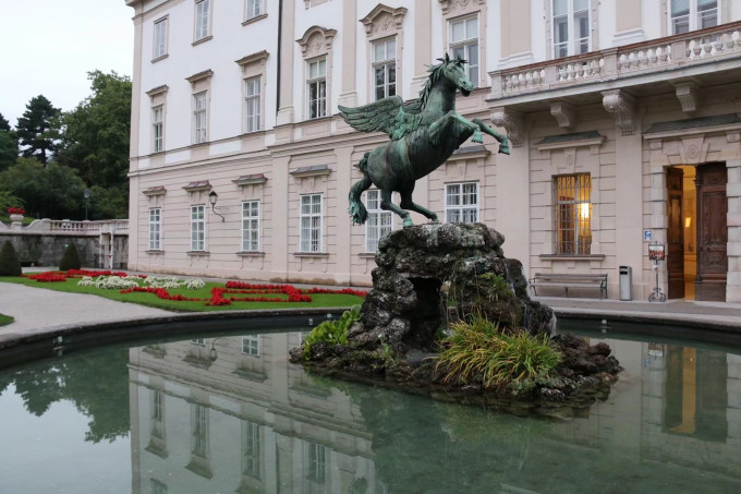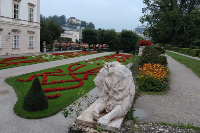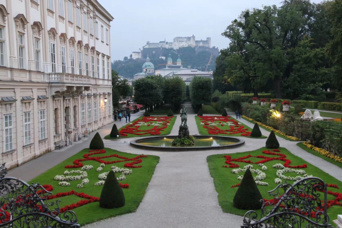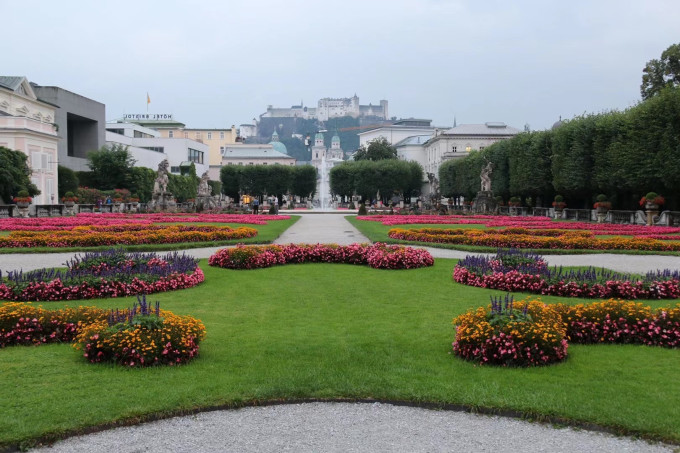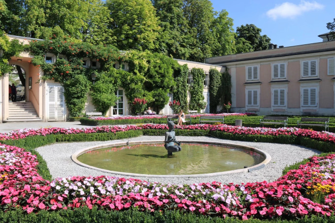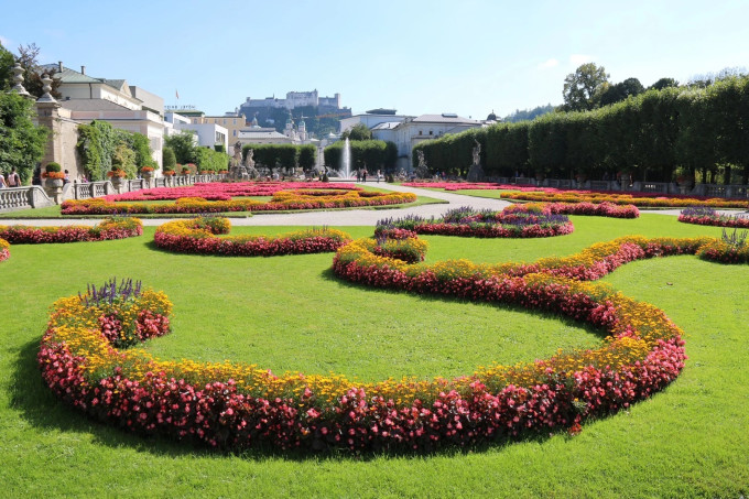 米拉贝尔花园于1690年由大主教约翰·恩斯特·冯·图恩(Johann Ernst von Thun)进行了重新设计。巴洛克时期的典型几何形状仍然清晰可辨,朝着大教堂和城堡的视觉取向增加了花园的宏伟性 - 同时将它们融入了城市的整体历史氛围中。米拉贝尔花园,以及 Felsenreitschule 莫扎特音乐厅和 Nonnberg 侬伯格修道院是好莱坞著名的音乐剧电影 “音乐之声” 中最主要的拍摄地点。 在影片中,玛丽亚和孩子们在宫殿前的飞马喷泉周围跳舞,唱着 “Do Re Mi”。 场景结束时,特拉普一家人站在玫瑰山前的台阶上,演唱这首歌的最后小节。