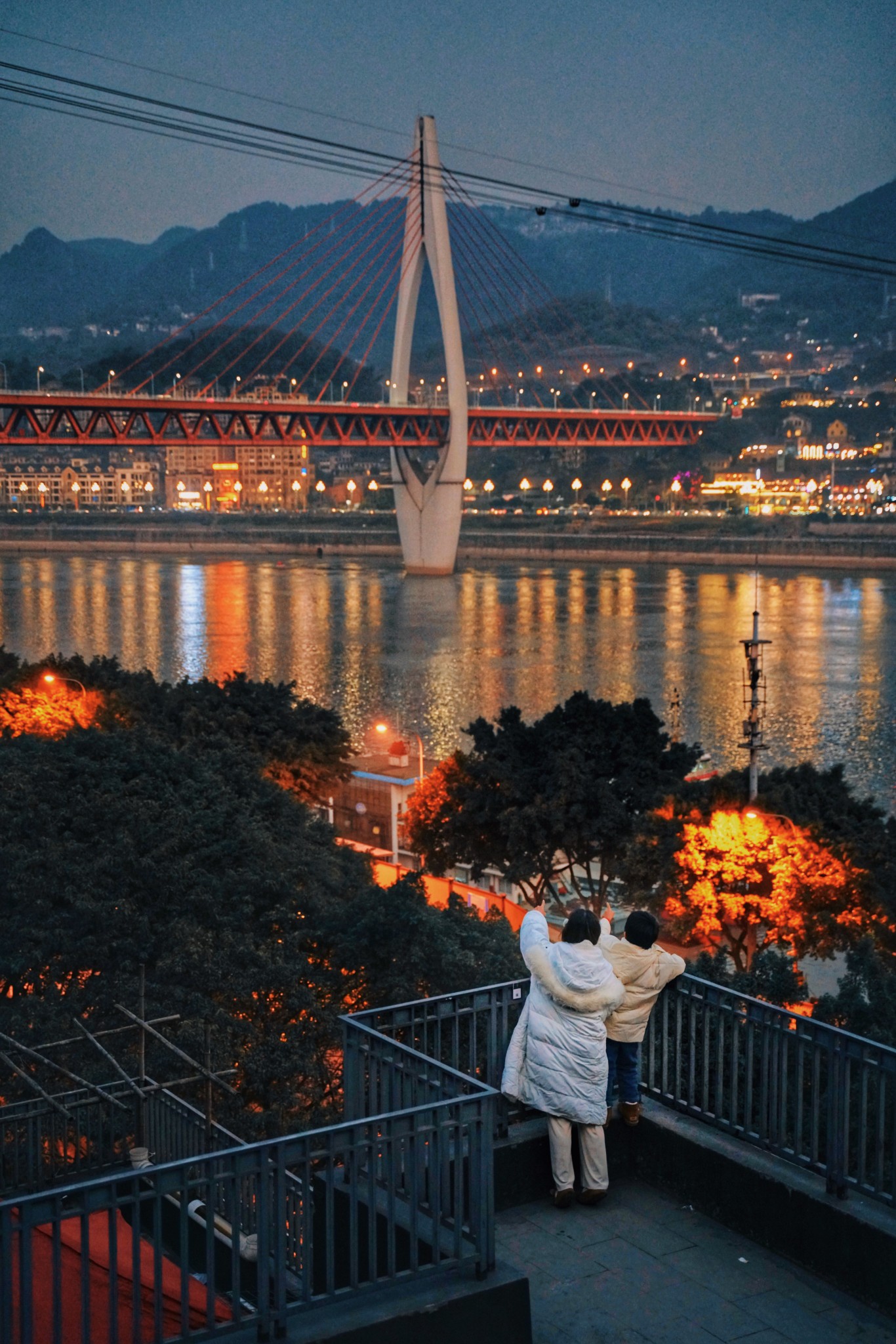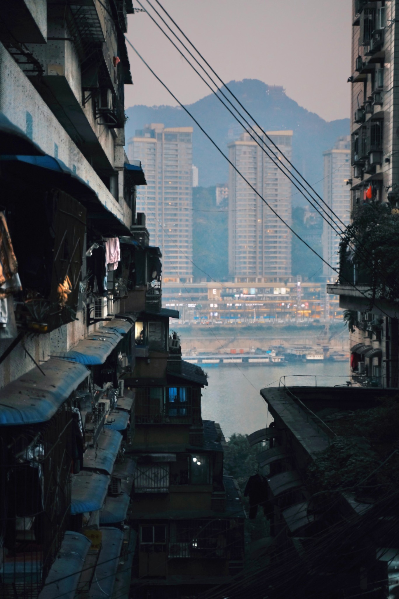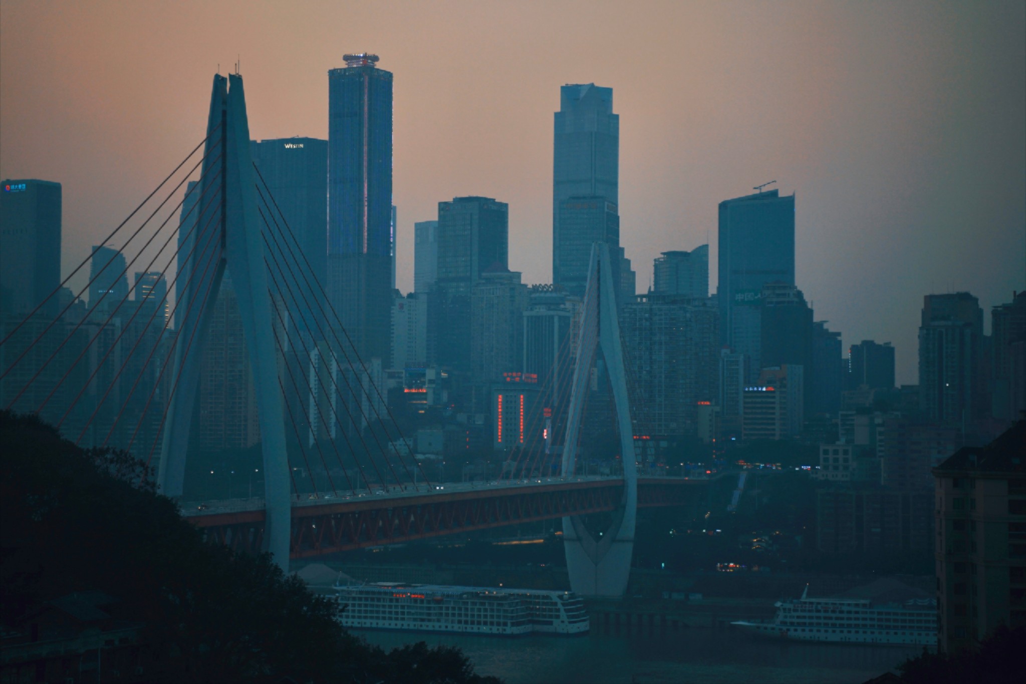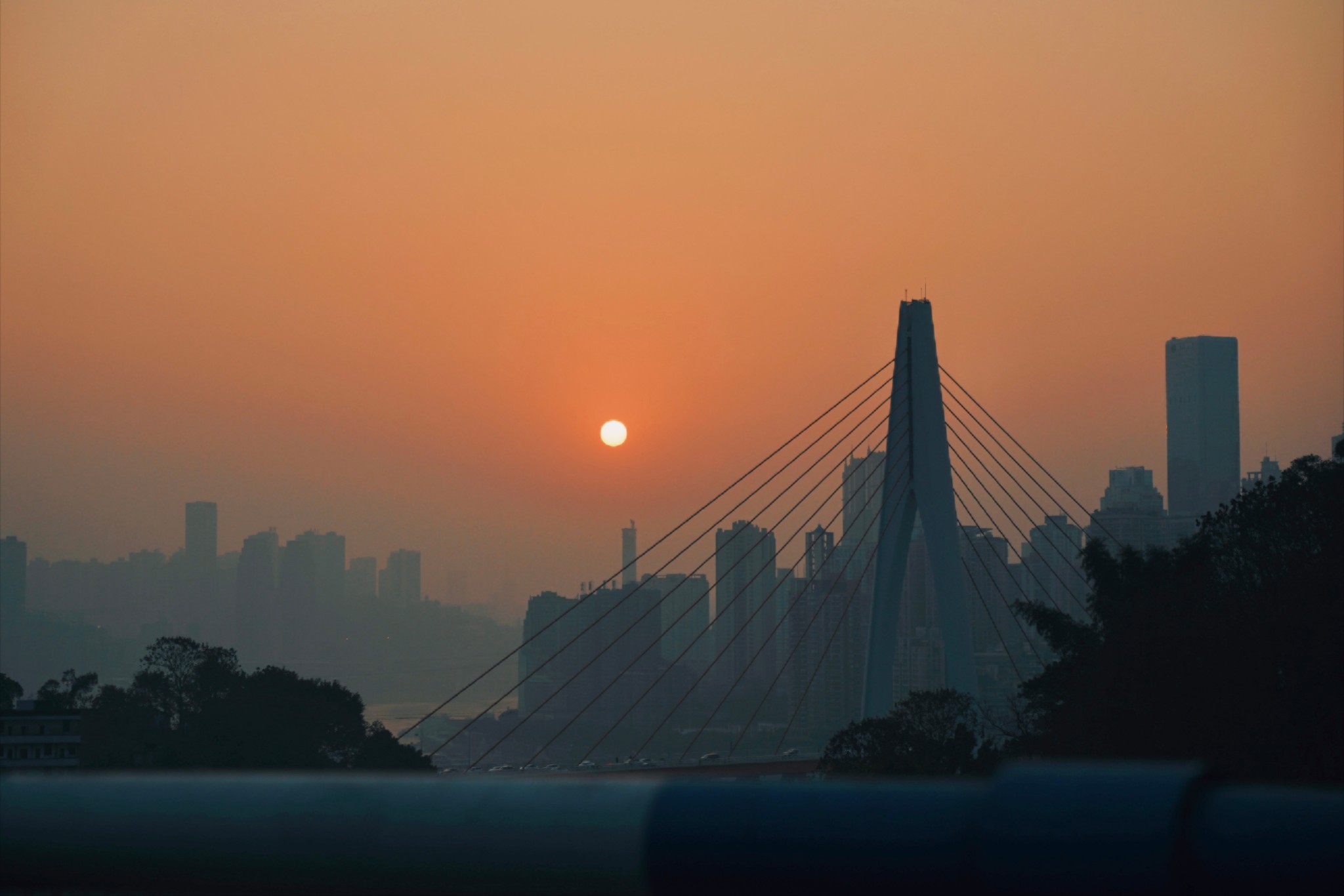我们发现,重庆的夕阳好像比其他地方的要更大一些、更红一些。老赵说这是因为有雾气,所以就如同晕染一样,整个夕阳的边缘都大了一圈,也正正是因为有雾气,夕阳下层层叠叠的楼房也像剪影一般,有种唯美感。