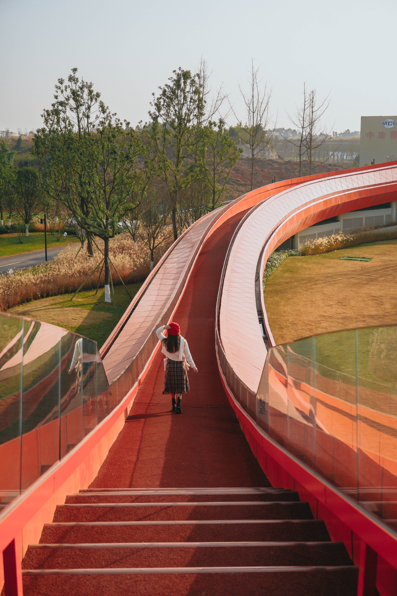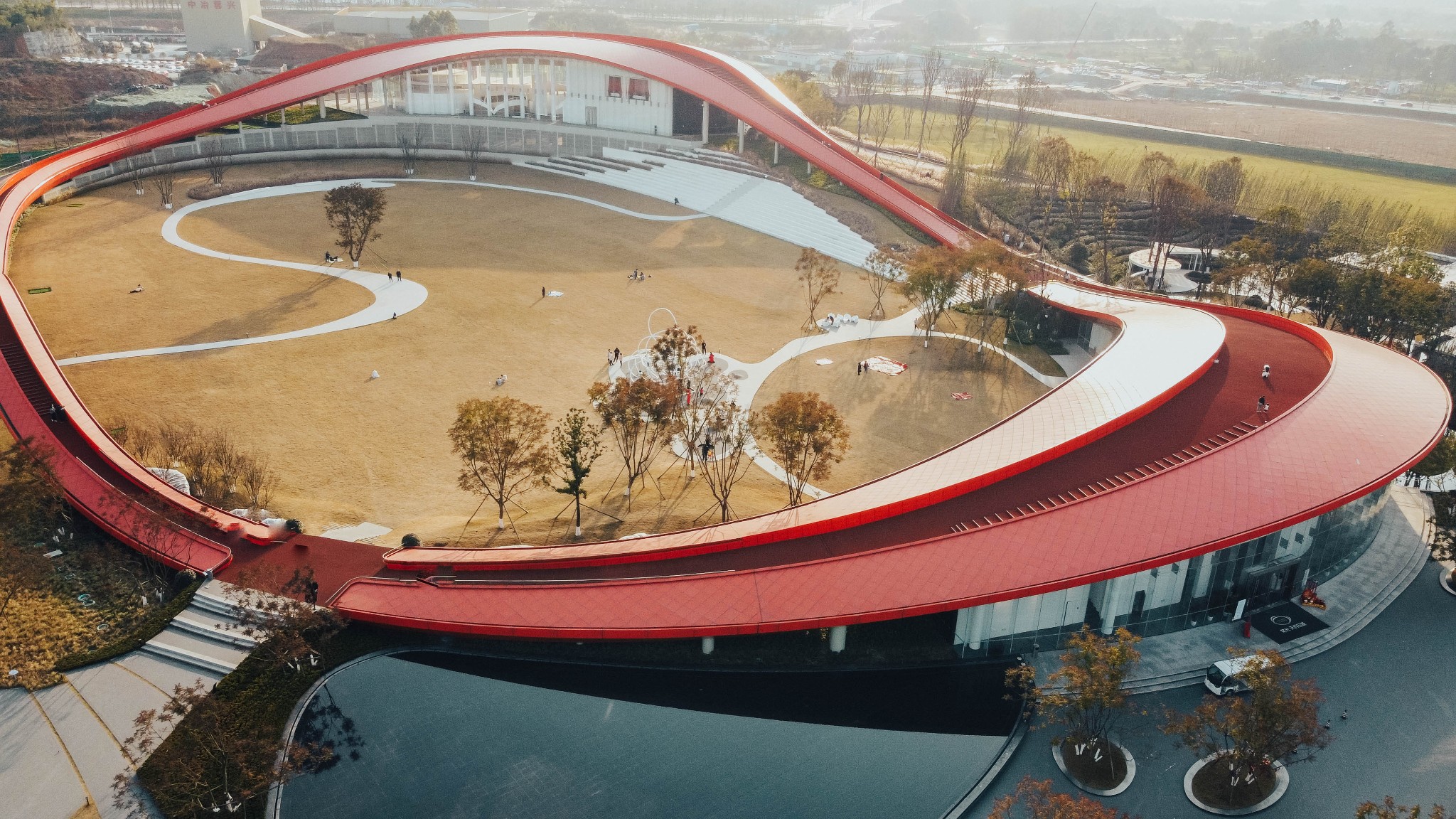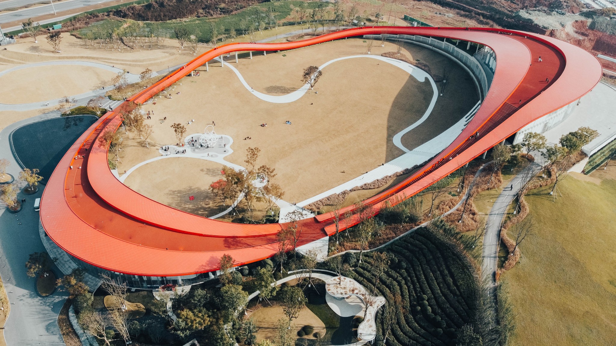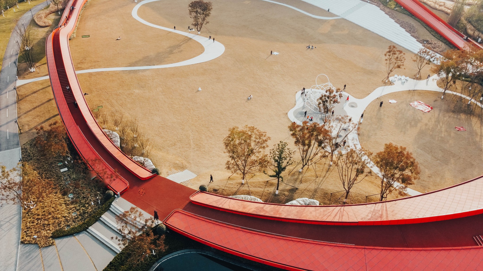 纯红色的圆环和周围的绿色草地植物相结合,色彩搭配很亮眼。特别是像波浪起伏的环形步行道,高低错落,很适合拍出背景纯净的大片。