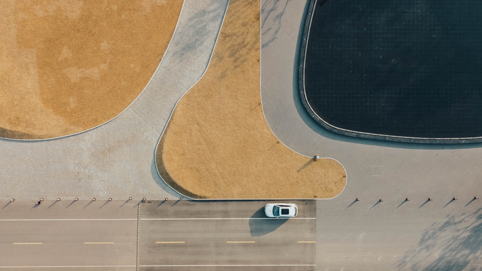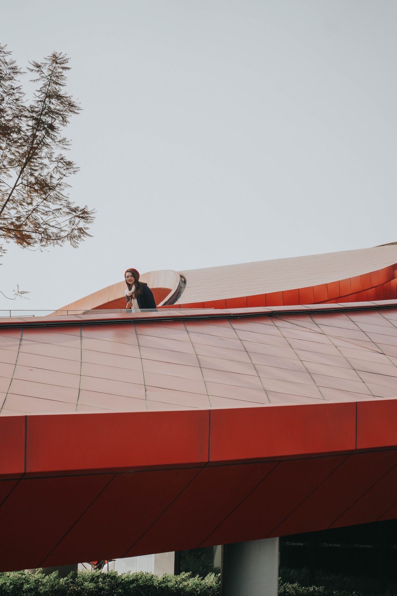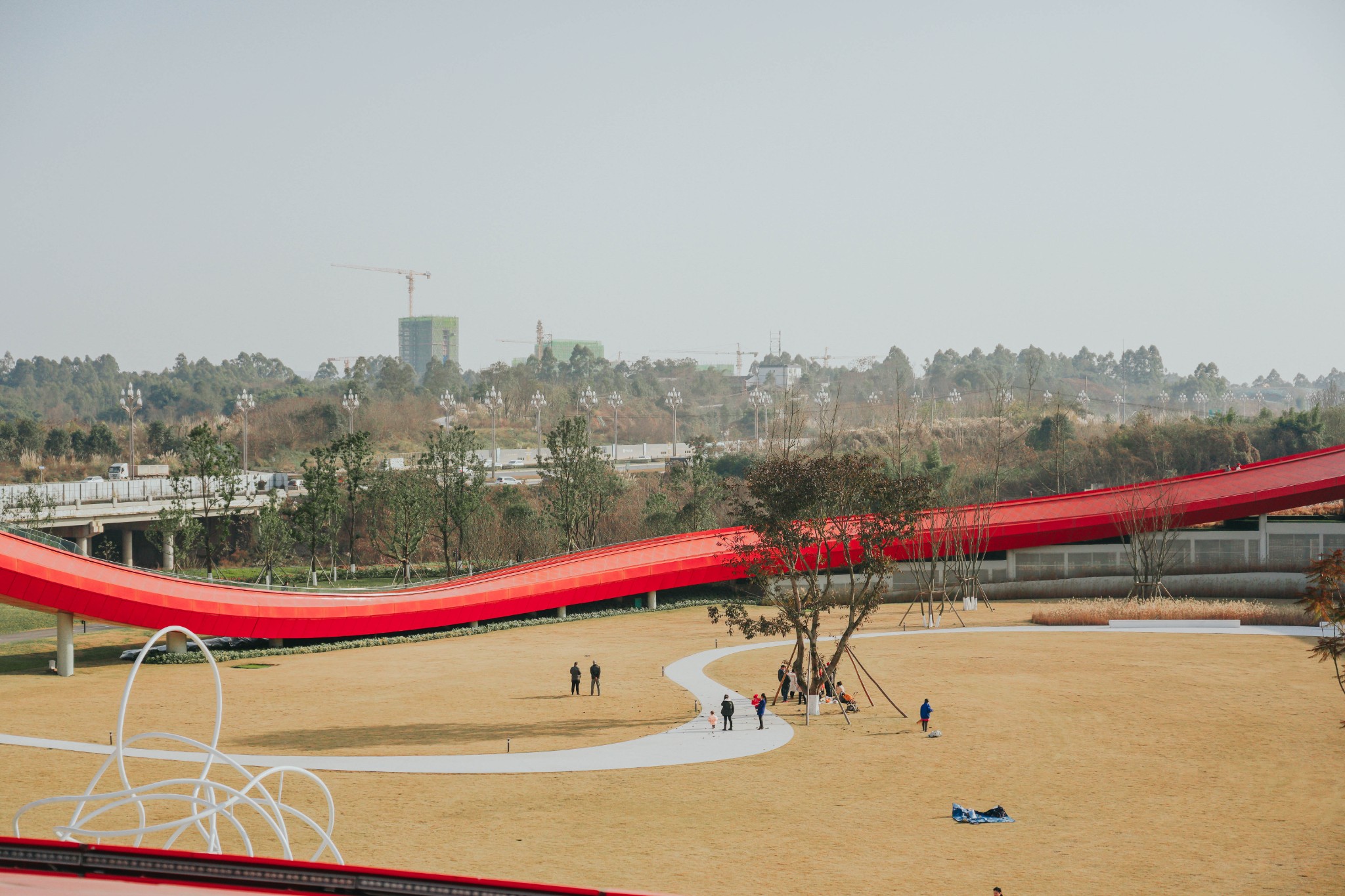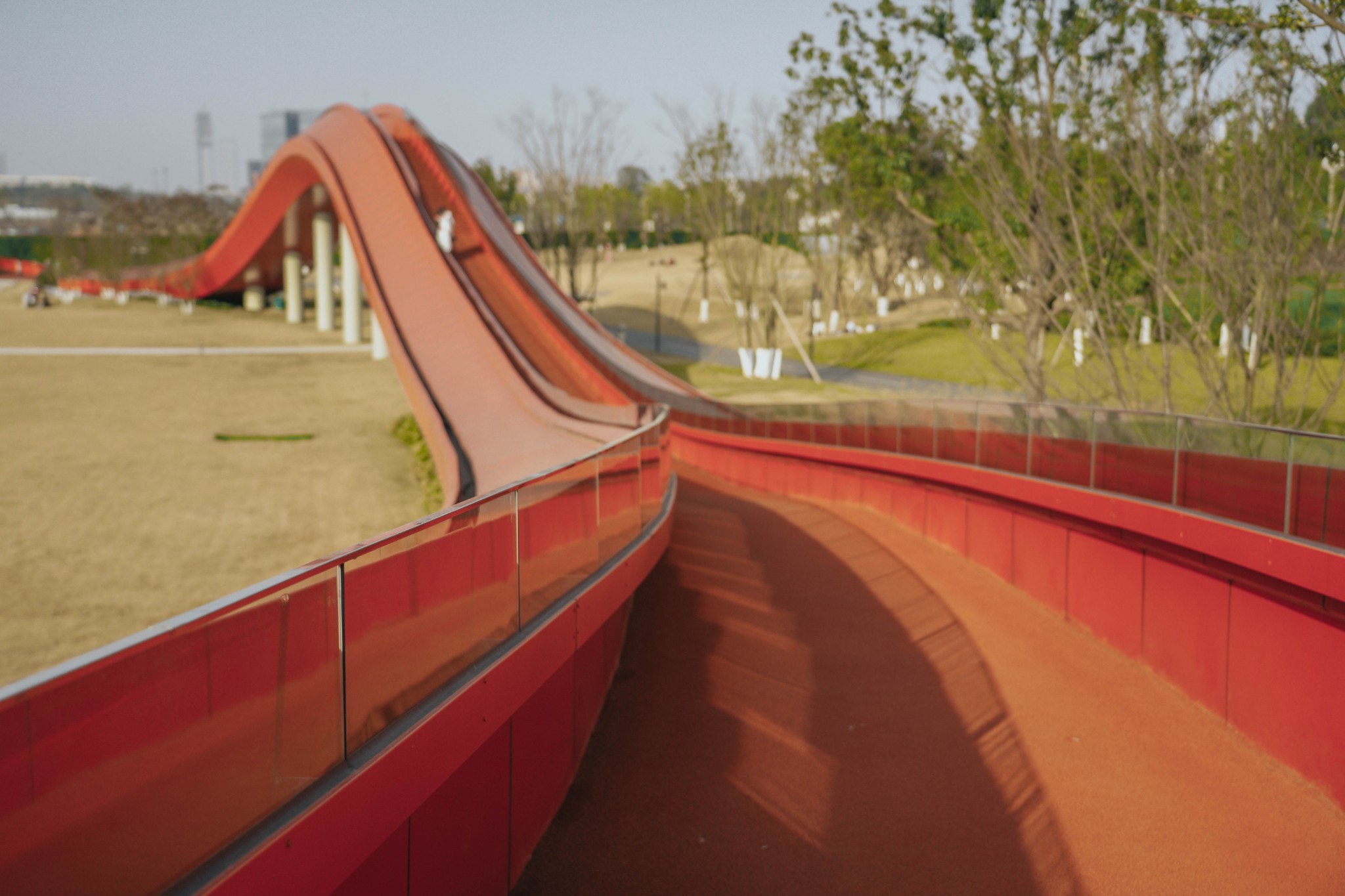 纯红色的圆环和周围的绿色草地植物相结合,色彩搭配很亮眼。特别是像波浪起伏的环形步行道,高低错落,很适合拍出背景纯净的大片。