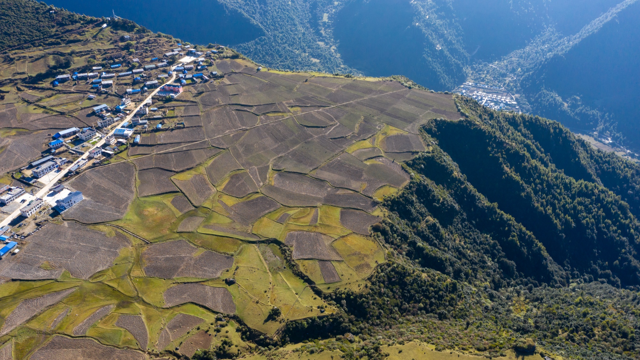 坐落于3000米的山顶之上的乃夏村,俯瞰之下,被农田和森林所包裹如天空之城一般悬浮在吉隆镇之上。