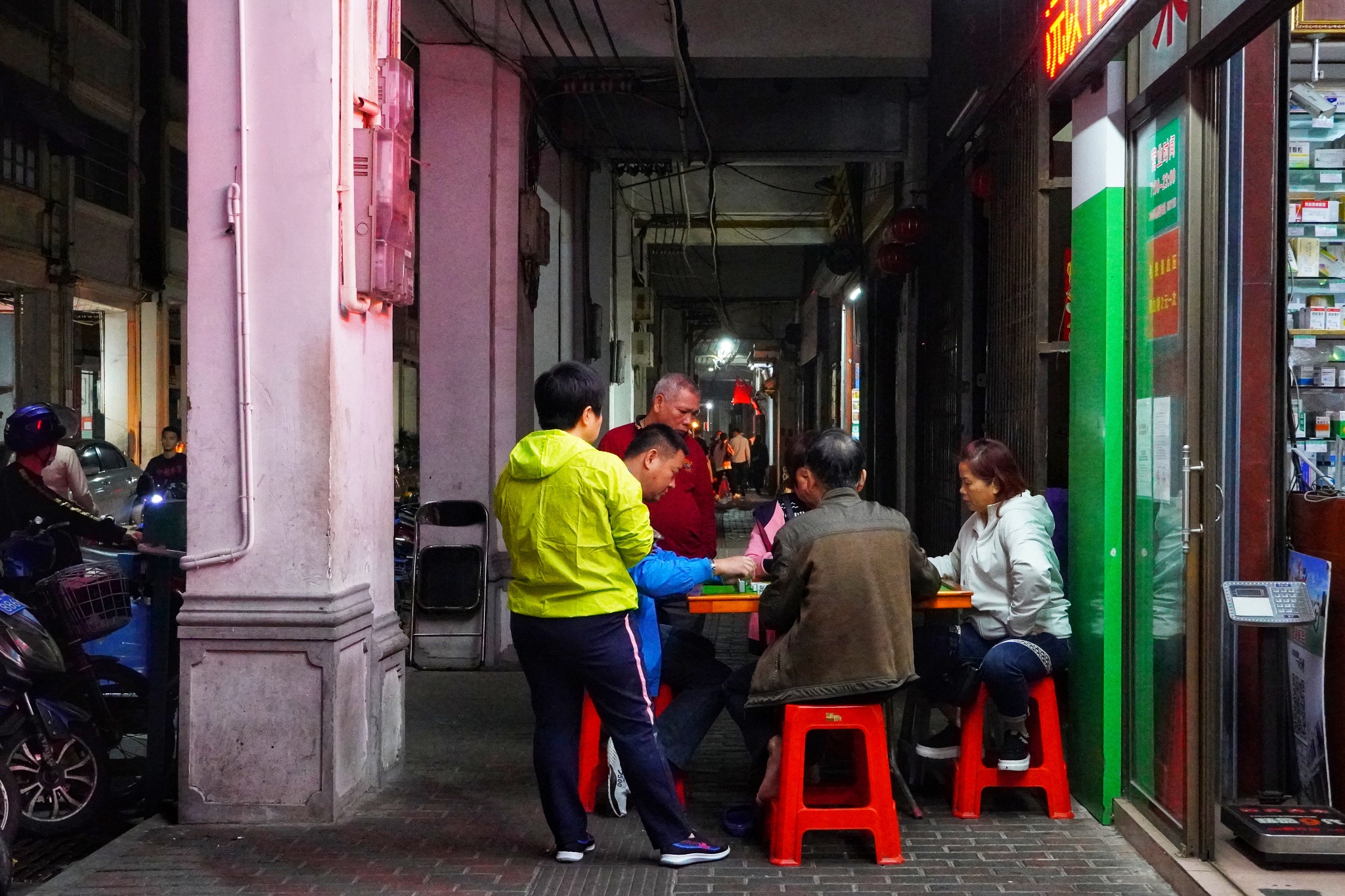 骑楼老街上,与历史的记忆共存的,还有当下生活的味道。走在街道上,时不时就会遇到当地人在骑楼下打牌吃火锅,我观察了一下,如果是吃炒菜,几乎桌桌都有白切鸡,吃火锅呢,大家最爱吃的就是牛杂煲,夜晚的街边,牛杂煲香气袅袅,太幸福了!