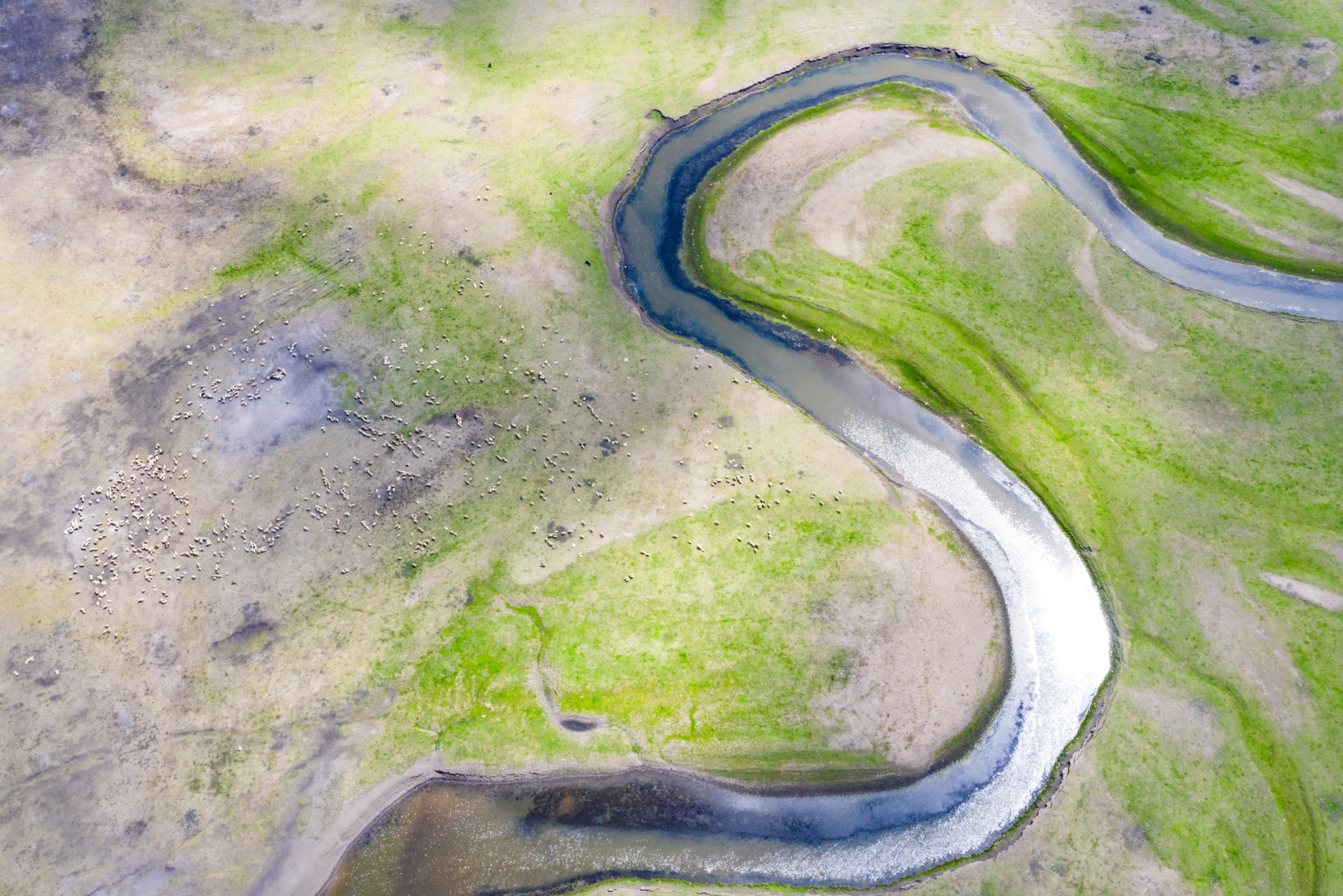 6月份的草原还是有一些青黄不接,莫日格勒河从草原中穿过。莫日格勒河发源于大兴安岭,它是一条河道狭窄但却极度弯曲的河流。登高远望,潺潺的河水就像是一条舞动的绸带,带着仙风道气飘落在碧绿如玉、平坦无际的大草原上向东行驶。闭眼享受片刻,再一抬头,河水又在向西流淌。一会儿又向南奔去,和同伴交流的瞬间,河水却又向北挺进。莫日格勒河不愧是老舍笔下“天下第一曲水”,何止是九曲十八弯。