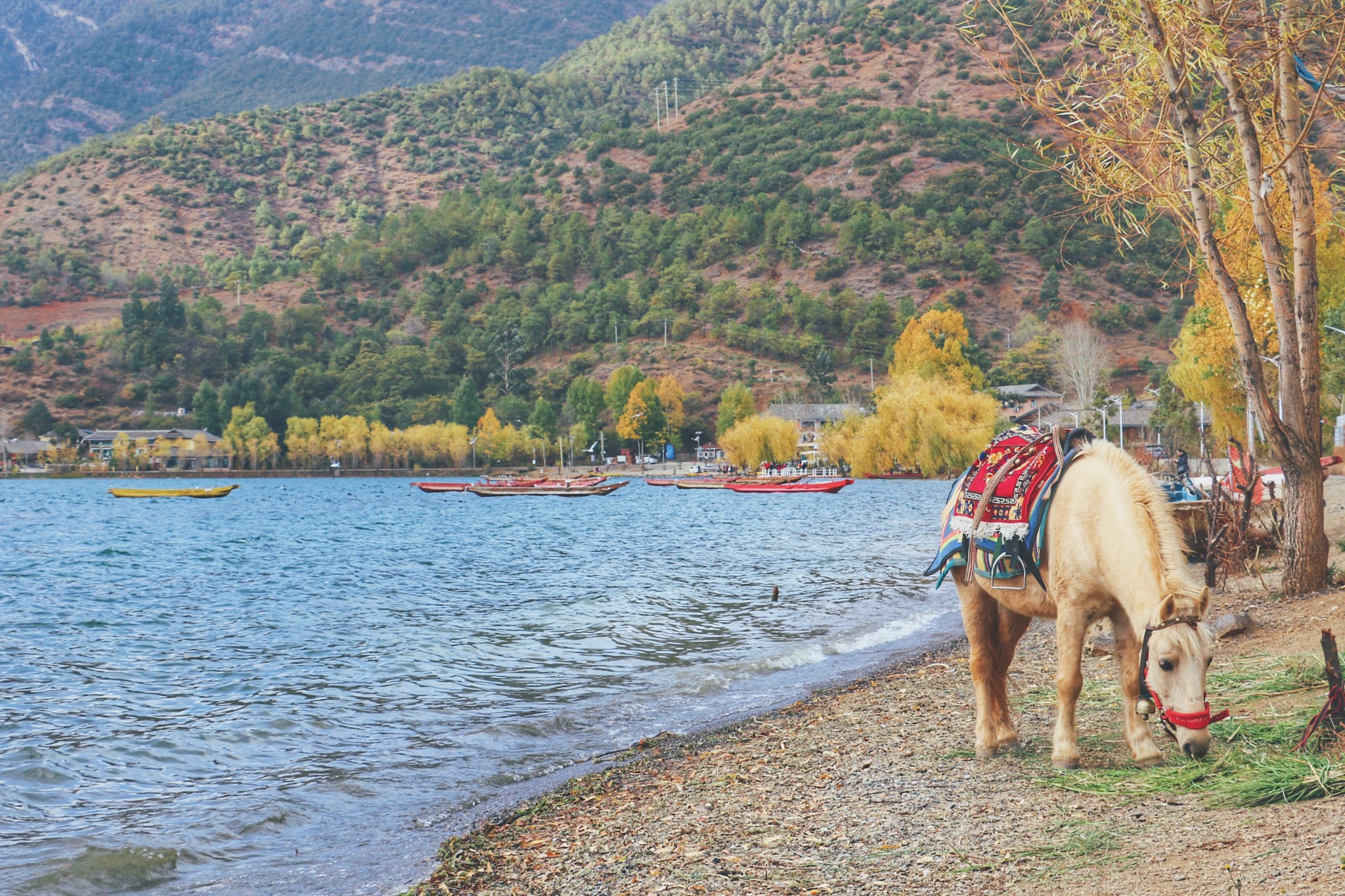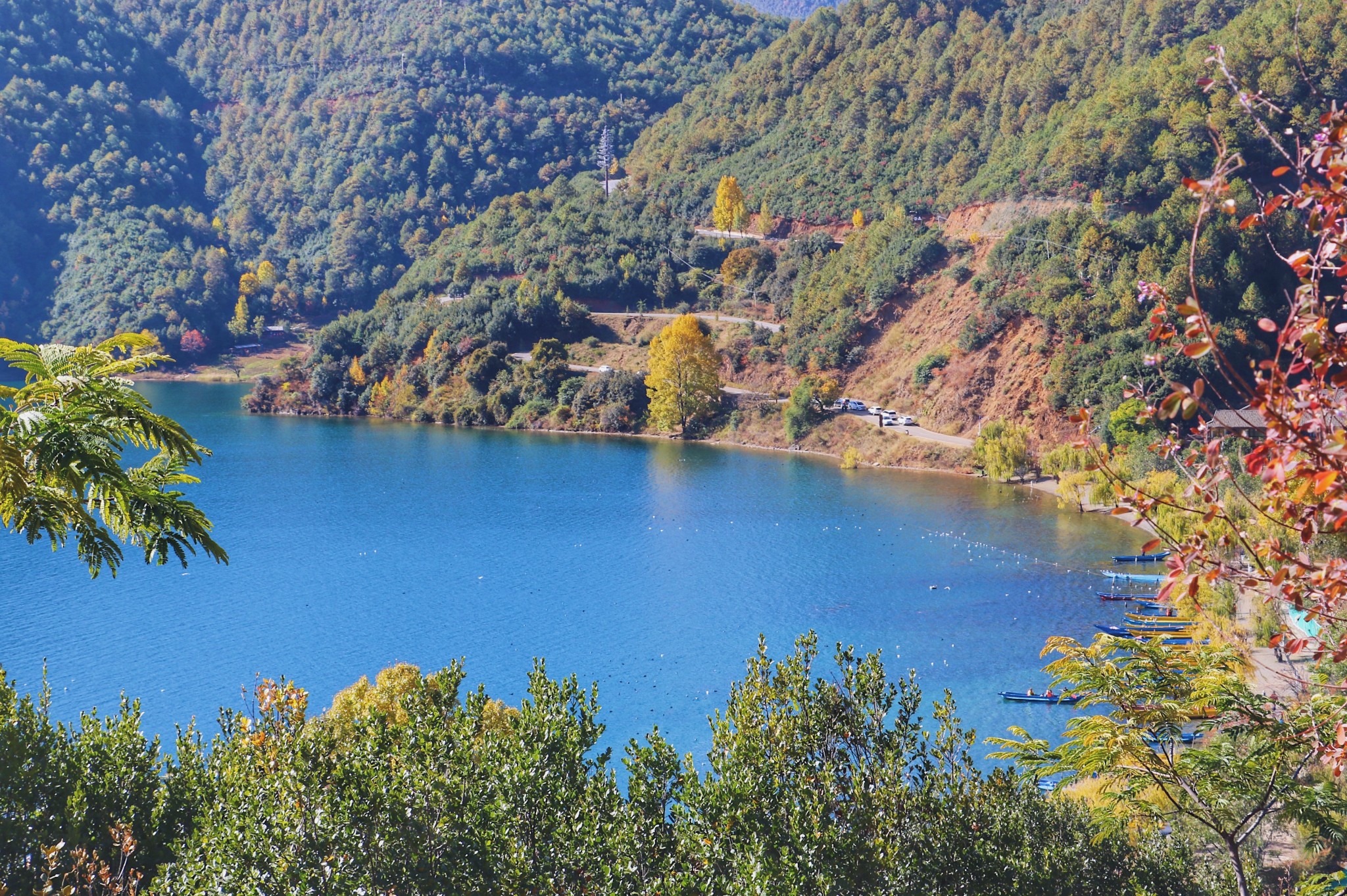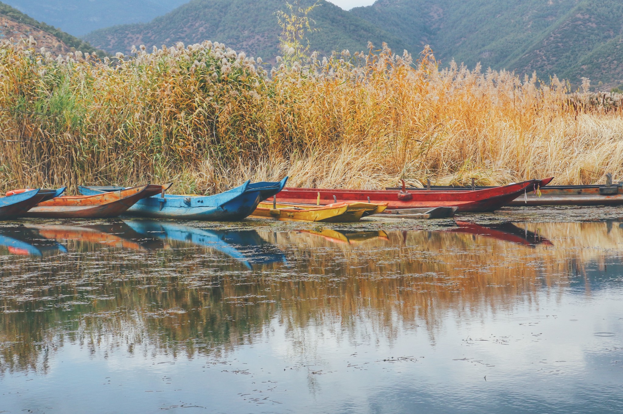 湖边停着许多五颜六色的猪槽船,我能想象泸沽湖的晚霞和日落能有多迷人。