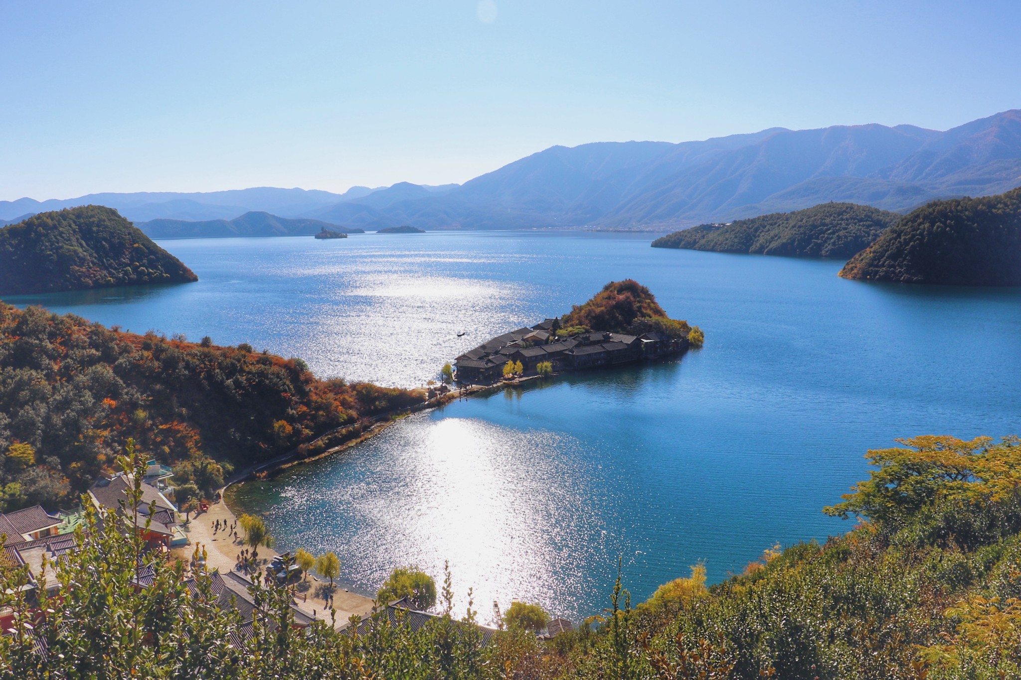 在观景台俯瞰泸沽湖风光,可以看到湖面是心形的,让这里成了浪漫的心形岛,据说在这里打卡可以收获美好的爱情。湖面在不同的时间映衬出不一样的颜色,美的像一张明信片。