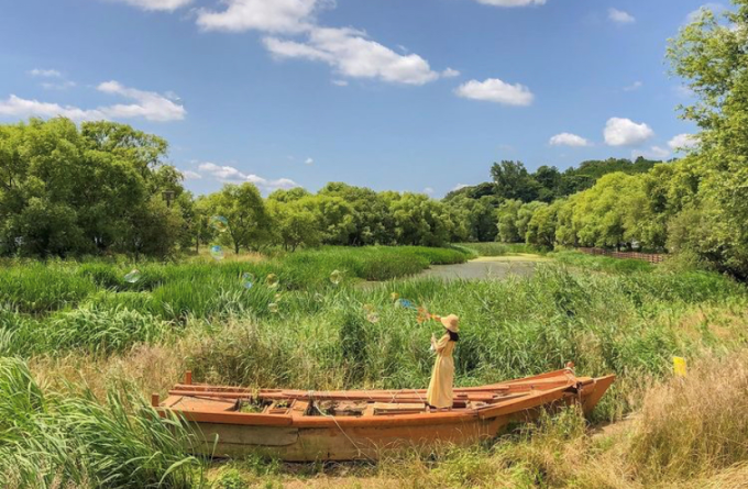 这里以江边草绿的树林和渡船形成的独特风景为背景,江边绿油油的树林,配着旁边渡轮,一定能留下最美的你的样子。