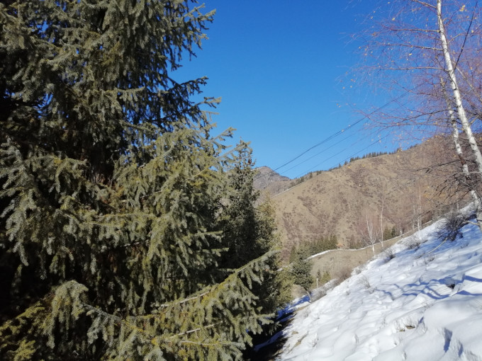 大约几公里。山区雪没清理,越往里走路面积雪约多,大坡一般小车,根本上不去,打滑,山里狭窄路面车还是不少。有个几十辆,也没地停,就沿路边停,到了徒步栈道附近,天气晴朗,天空湛蓝,暖洋洋。