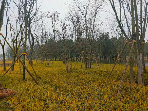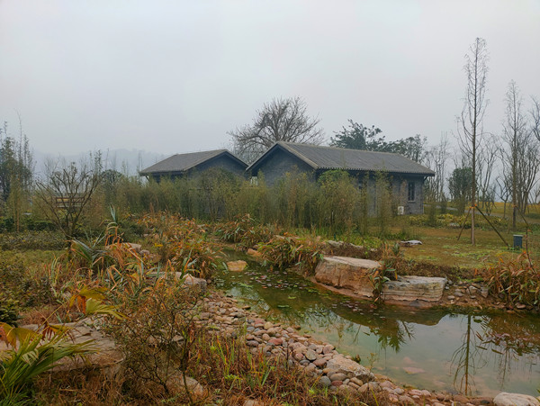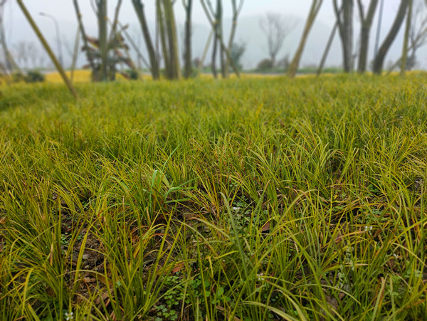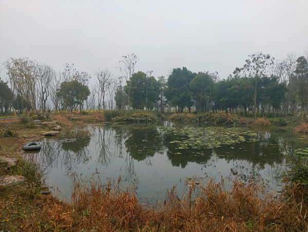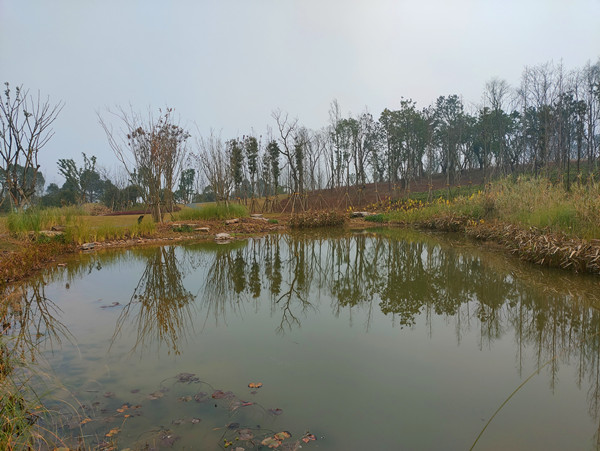 西岛头生态修复区是进入广阳岛的第一门户节点,修复策略以营林为主,结合护山、理水、丰草三大策略十三项措施,修补山体、保护山林,形成四季多彩的近自然生态风景林。随坡就势种植的黄葛树、水杉、朴树、香樟、慈竹、巴茅等乡土植物展现出山地林木葱茏、茂林修竹的重庆乡土森林意境。山林中的雨水径流以重力流的自然形式通过绿色基础设施有序组织,经过植物净化、智慧监测,最终得以合理回用及达标排放,路沿边、溪流旁、林荫下广泛种植乡土草本植物,丰富了水岸生境多样性,构建了野生动物的自然栖息地。林中湖塘水系蜿蜒、道路栈道阡陌交通、相互串联,山容叠翠、水光旖旎,尽显绿丘起伏、林木层叠的“上坝叠翠”之美