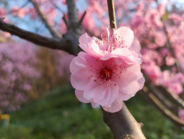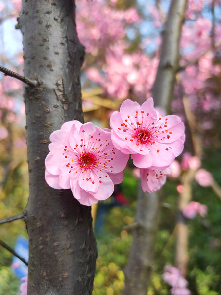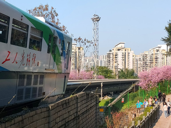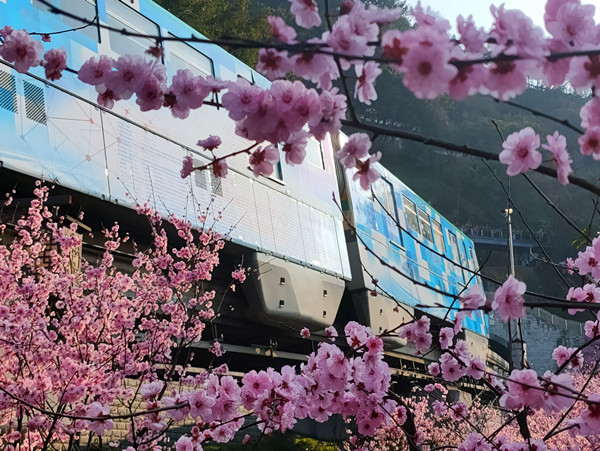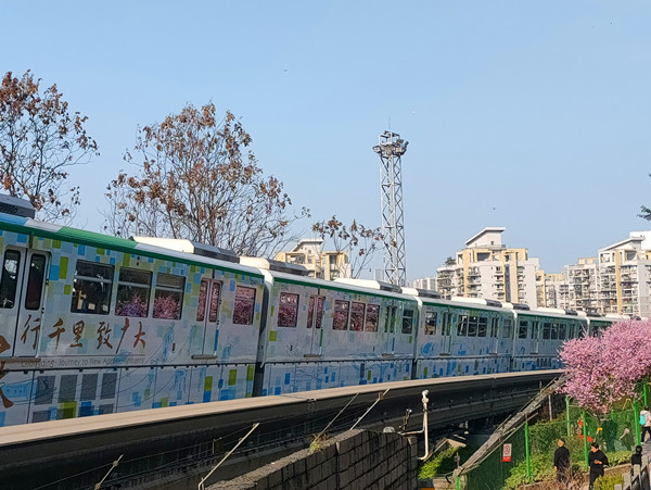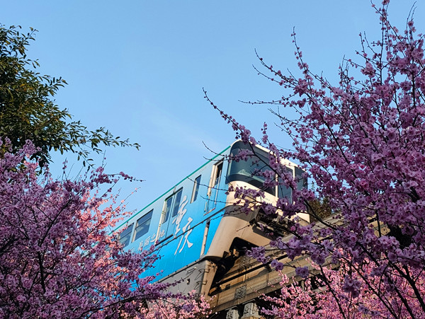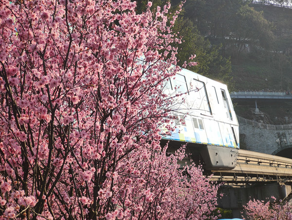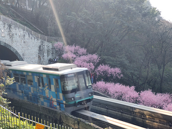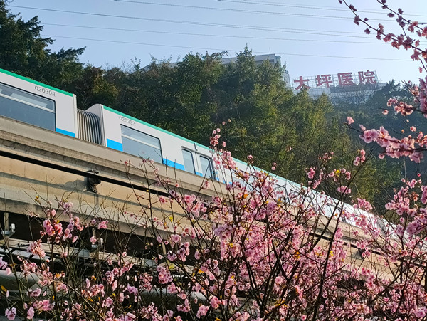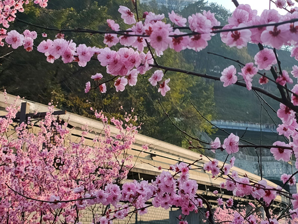 初二,半山崖线步道开通,笨蛋去走了一圈顺便写下游记:2021漫步半山崖线步道(从虎头岩到佛图关)。没想到才过这些天,佛图关到大坪沿线的美人梅花盛开,重庆轨道交通二号线列车穿行在花海中,如开往春天的列车,成为城市中一道亮丽的风景线,连人民日报、中央电视台都进行了相关报道。正好近些天重庆阳光明媚,笨蛋也在此前往步道,拍一拍“ 开往春天的列车”