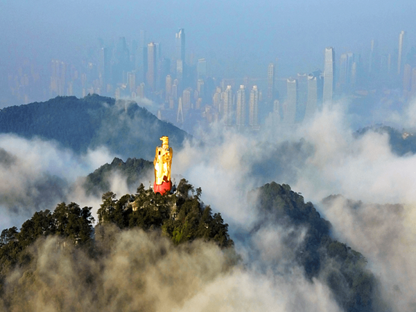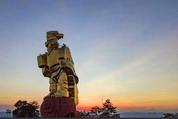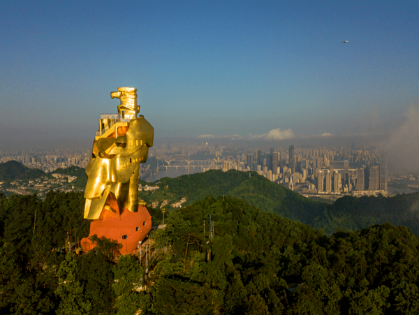 “大金鹰”雕塑,雄居在重庆南山671米高的鹞鹰岩上,水泥浇铸,高约50米,重千吨,外敷金箔,内设通道,游客可直登鹰的头部,上设有观景台,凭栏远眺,重庆数十里景物尽收眼底。大金鹰观景台比南山一棵树、壹华里夜景公园、三块石、老君洞更高,属于南山制高点,是重庆大名鼎鼎的地标建筑之一,每当飞机抵达重庆金光闪闪的大金鹰便是最先映入乘客眼帘的建筑,它也因此成为了众多电视剧、动漫的取景青睐地之一,在《鸟瞰新重庆》《人民的名义》中都曾出现其身影。这里也是拍摄重庆夜景的好地方,缺点就是到晚上384公交收班之后,下山的交通比较麻烦