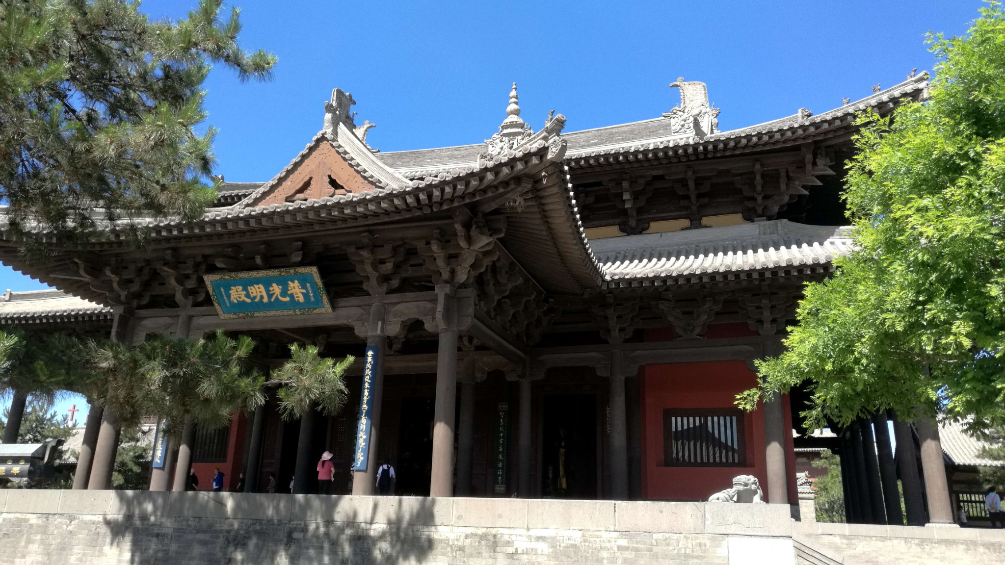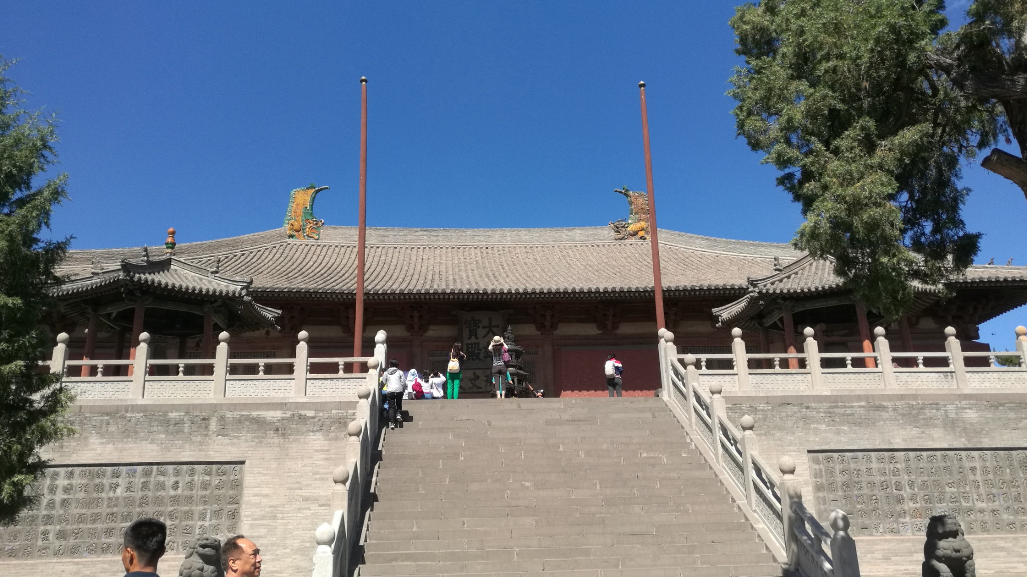 大雄宝殿始建于辽清宁八年(公元1062年),辽保大二年(公元1122年)毁于兵火,金天眷三年(公元1140年)依旧址重建。 大殿是建筑最高规格的庑殿顶,面阔九间,进深五间,总面积为1559平方米,耸立于五米高台之上,为现存古代木构宗教单体建筑中规模最大者。